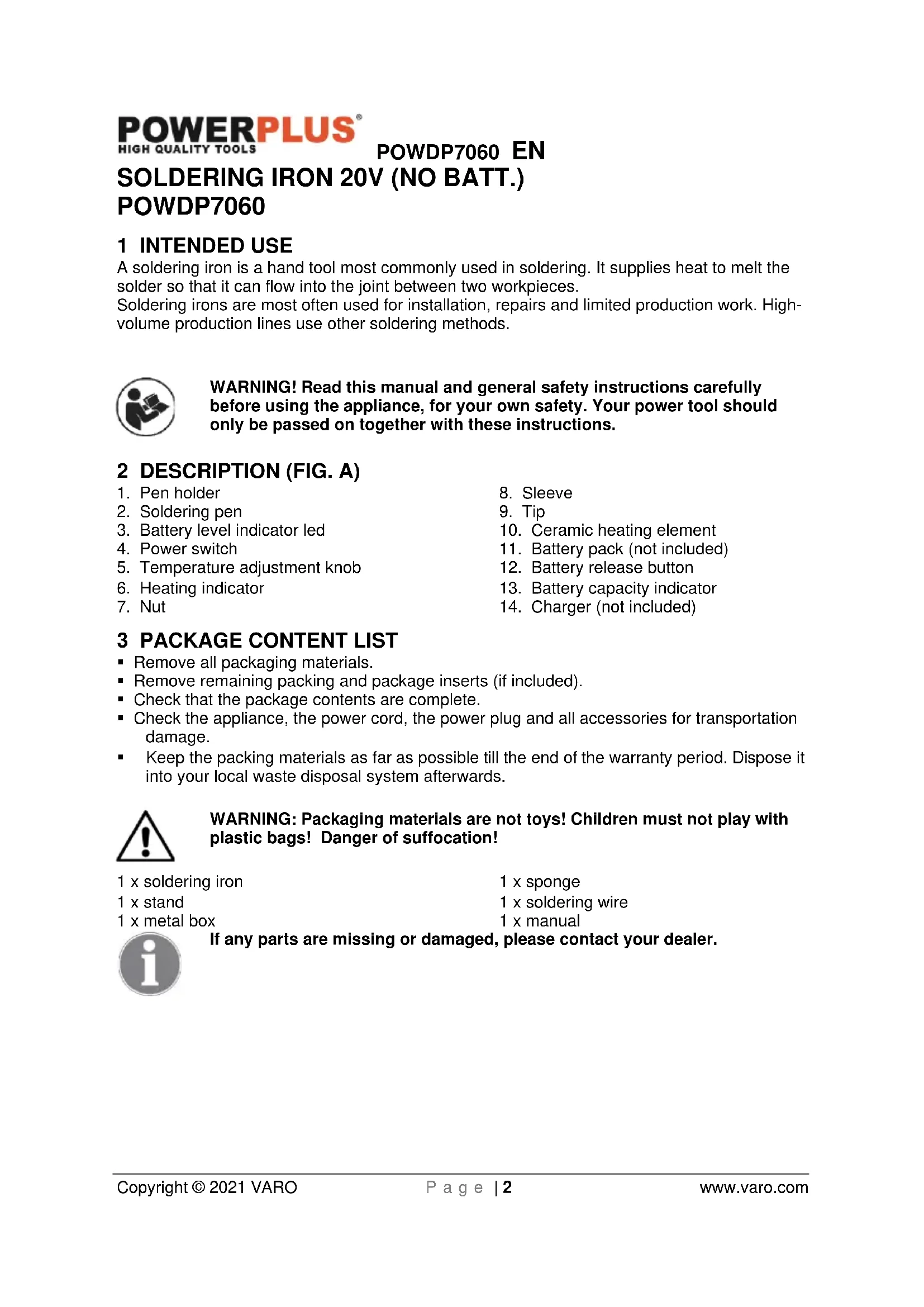 Copyright © 2021 VARO P a g e | 2 www.varo.com SOLDERING IRON 20V (NO BATT.) POWDP7060 1 INTENDED USE A soldering iron is a hand tool most commonly used in soldering. It supplies heat to melt the solder so that it can flow into the joint between two workpieces. Soldering irons are most often used for installation, repairs and limited production work. High- volume production lines use other soldering methods. WARNING! Read this manual and general safety instructions carefully before using the appliance, for your own safety. Your power tool should only be passed on together with these instructions. 2 DESCRIPTION (FIG. A)