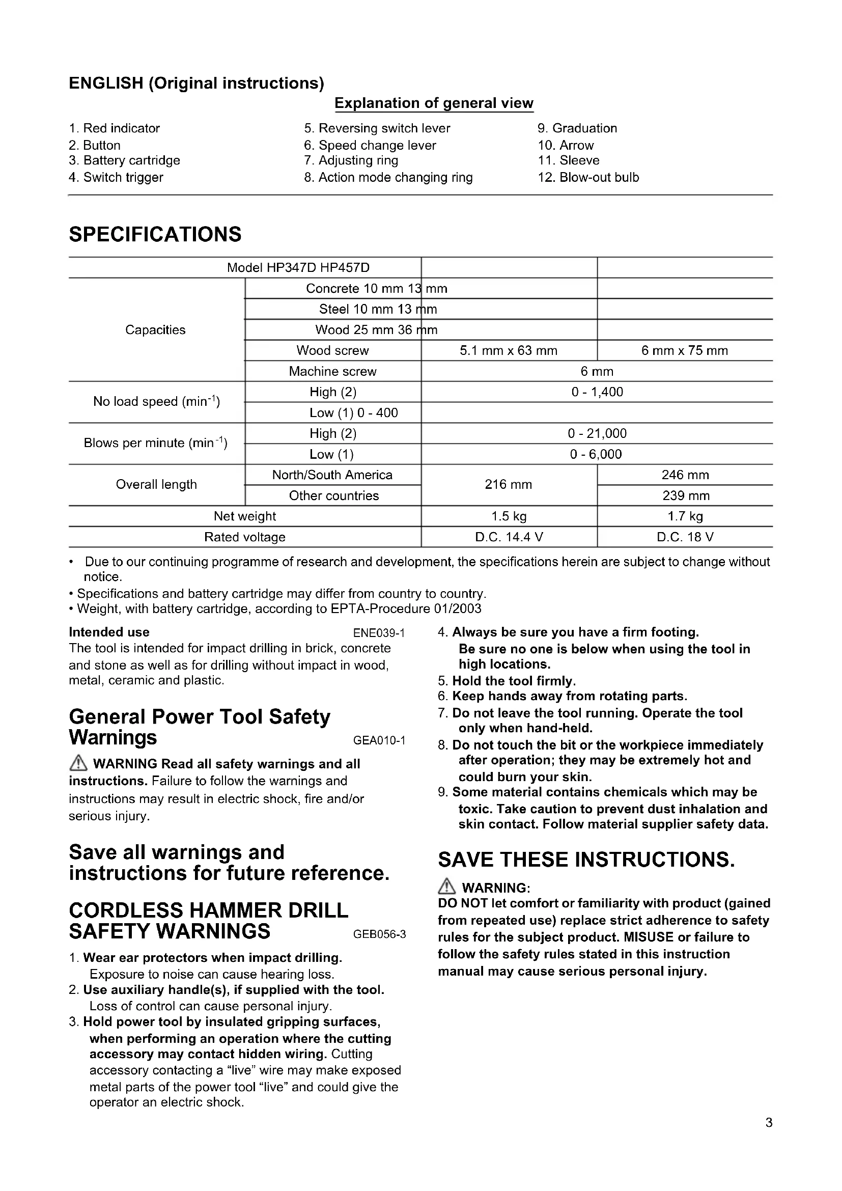 - Weight, with battery cartridge, according to EPTA-Procedure 01/2003 Intended use ENE039-1 The tool is intended for impact drilling in brick, concrete and stone as well as for drilling without impact in wood, metal, ceramic and plastic. General Power Tool Safety Warnings GEA010-1 WARNING Read all safety warnings and all instructions. Failure to follow the warnings and instructions may result in electric shock, fire and/or serious injury. Save all warnings and instructions for future reference.