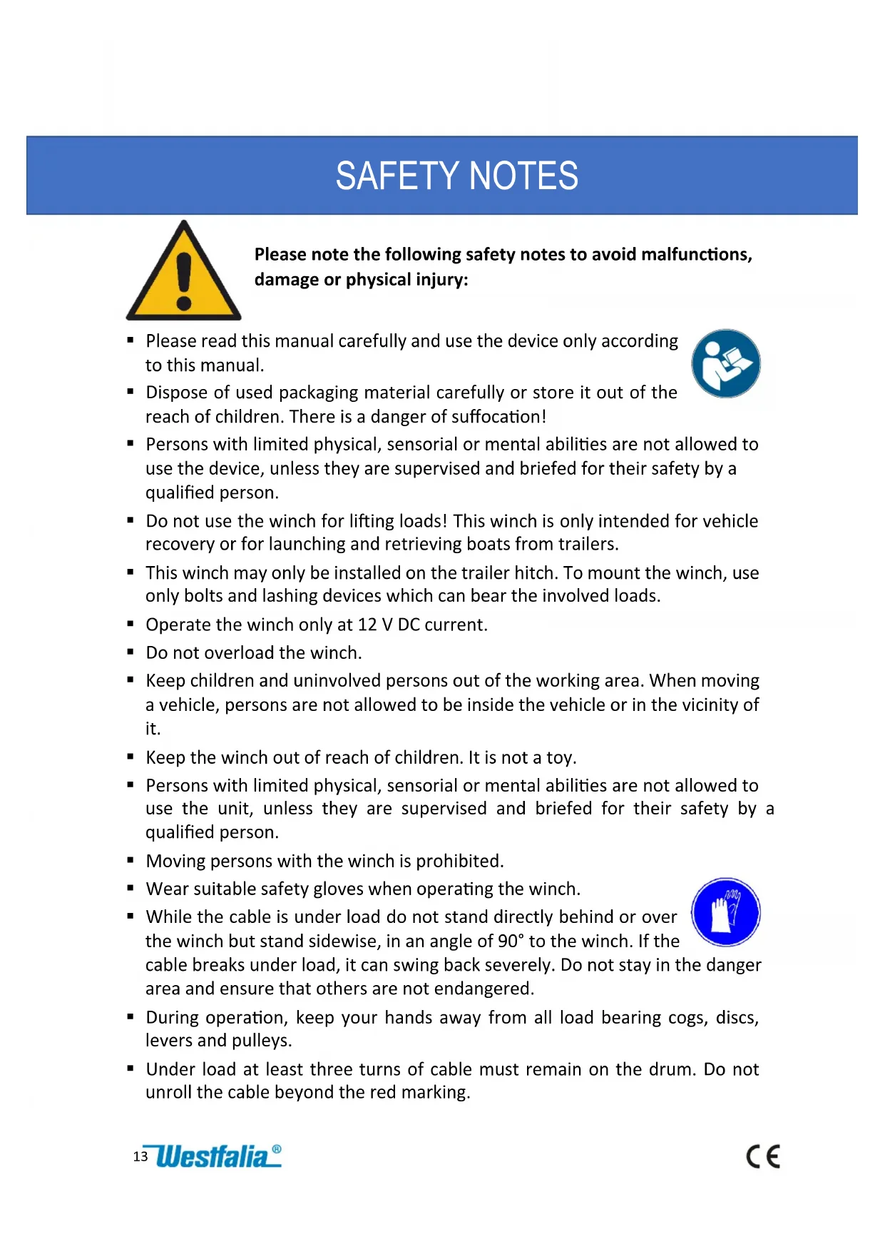 Hinweis Durch das Verwenden der Umlenkrolle lässt sich die effektive Zugkraft verdoppeln.13 Please note the following safety notes to avoid malfunctions, damage or physical injury: Please read this manual carefully and use the device only according to this manual. Dispose of used packaging material carefully or store it out of the reach of children. There is a danger of suffocation! Persons with limited physical, sensorial or mental abilities are not allowed to use the device, unless they are supervised and briefed for their safety by a qualified person. Do not use the winch for lifting loads! This winch is only intended for vehicle recovery or for launching and retrieving boats from trailers. This winch may only be installed on the trailer hitch. To mount the winch, use only bolts and lashing devices which can bear the involved loads. Operate the winch only at 12 V DC current. Do not overload the winch. Keep children and uninvolved persons out of the working area. When moving a vehicle, persons are not allowed to be inside the vehicle or in the vicinity of it. Keep the winch out of reach of children. It is not a toy. Persons with limited physical, sensorial or mental abilities are not allowed to use the unit, unless they are supervised and briefed for their safety by a qualified person. Moving persons with the winch is prohibited. Wear suitable safety gloves when operating the winch. While the cable is under load do not stand directly behind or over the winch but stand sidewise, in an angle of 90° to the winch. If the cable breaks under load, it can swing back severely. Do not stay in the danger area and ensure that others are not endangered. During operation, keep your hands away from all load bearing cogs, discs, levers and pulleys. Under load at least three turns of cable must remain on the drum. Do not unroll the cable beyond the red marking. SAFETY NOTES14 Before using the winch, make sure the cable is in perfect condition. Only use suitable lifting accessories for fastening the load. Do not use the winch to move loads which may drop or roll. If necessary; take precautions to prevent the load from falling over or rolling. Turn the crank only by hand; do not attach motors of any kind. Do not use the hand crank and the electric motor at the same time. This can lead to injuries and to damage to the winch. Use only original spare parts and accessory. The service life of the winch is limited, worn out parts must be replaced in a timely manner. The winch is designed and built in accordance to the applying safety regulations. Keep your working area clean and tidy. Do not operate the winch in areas where rain or other precipitation is present. Do not operate the winch on slippery grounds. Do not work with the unit in an area where an explosion hazard is present on account of flammable liquids, gases or dusts. Wear suitable clothes. Do not wear loose clothes or jewellery. Keep hair, clothes and gloves away from moving parts. Do not use the winch any further if the winch or the power cable is damaged. Service the unit carefully. Check that movable parts function correctly and do not jam, and whether any parts are broken or damaged in such a way that the function of the unit is impaired. Have any damaged part repaired before using the unit. Only allow qualified technicians to repair your unit using only original replacement parts. Once a year, have the unit checked by a qualified service technician. When connecting to the vehicle battery observe the applicable instructions of the vehicle manufacturer. Note that the winch a has power consumption of approx. 125 W. Do not pinch the power cable. There is a short-circuit and fire hazard. Do not use the winch from a motor vehicle with a running engine. Never operate the winch at the same time when a charger is connected. If you pull heavy loads, hang a blanket or a jacket on the cable in a distance of about 1 – 2 m away from the hook in order to significantly reduce the risks caused by a breaking cable. Make sure that the warning signs on the winch are clearly legible at all times. Before each use inspect the cable for any kinks, knots or damage.15 If the cable is kinked or damaged, or if it is shaking under load, do not use it any further, have it checked and repaired by a qualified technician. The winch must never be used longer than 5 minutes without interruption.