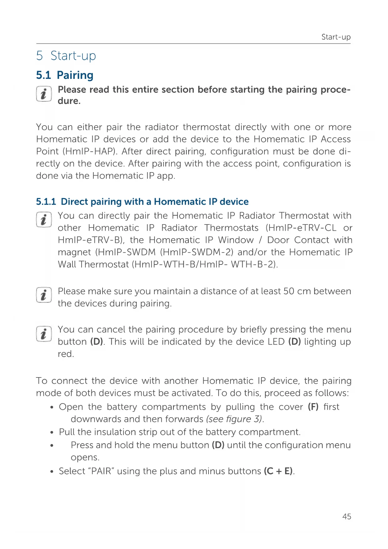 Please read this entire section before starting the pairing proce- dure. You can either pair the radiator thermostat directly with one or more Homematic IP devices or add the device to the Homematic IP Access Point (HmIP-HAP). After direct pairing, configuration must be done di- rectly on the device. After pairing with the access point, configuration is done via the Homematic IP app.