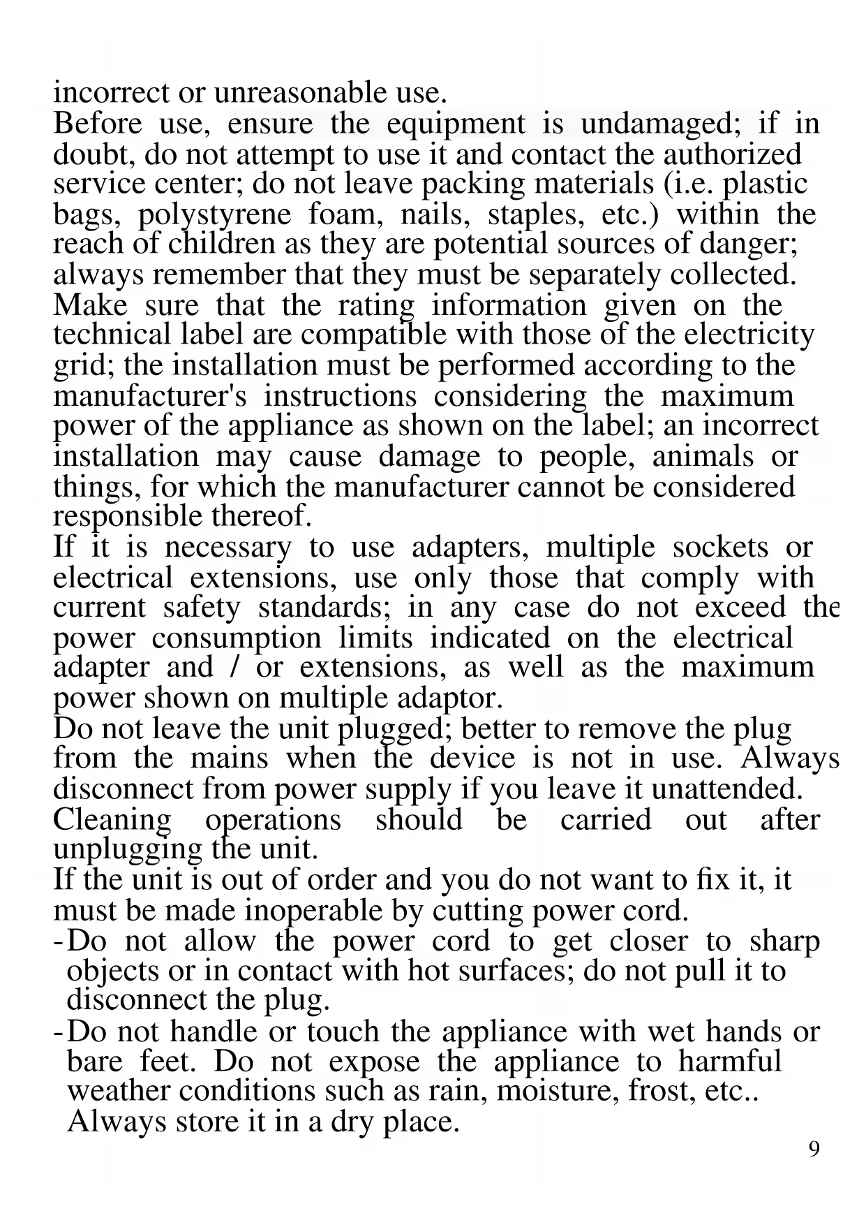 The following are important notes on the installation, use and maintenance; save this instruction manual for future reference; use the equipment only as specified in this guide; any other use is considered improper and dangerous; therefore, the manufacturer cannot be held responsible in the event of damages caused by improper,9 incorrect or unreasonable use. Before use, ensure the equipment is undamaged; if in doubt, do not attempt to use it and contact the authorized service center; do not leave packing materials (i.e. plastic bags, polystyrene foam, nails, staples, etc.) within the reach of children as they are potential sources of danger; always remember that they must be separately collected. Make sure that the rating information given on the technical label are compatible with those of the electricity grid; the installation must be performed according to the manufacturer's instructions considering the maximum power of the appliance as shown on the label; an incorrect installation may cause damage to people, animals or things, for which the manufacturer cannot be considered responsible thereof. If it is necessary to use adapters, multiple sockets or electrical extensions, use only those that comply with current safety standards; in any case do not exceed the power consumption limits indicated on the electrical adapter and / or extensions, as well as the maximum power shown on multiple adaptor. Do not leave the unit plugged; better to remove the plug from the mains when the device is not in use. Always disconnect from power supply if you leave it unattended. Cleaning operations should be carried out after unplugging the unit. If the unit is out of order and you do not want to fix it, it must be made inoperable by cutting power cord. - Do not allow the power cord to get closer to sharp objects or in contact with hot surfaces; do not pull it to disconnect the plug. - Do not handle or touch the appliance with wet hands or bare feet. Do not expose the appliance to harmful weather conditions such as rain, moisture, frost, etc.. Always store it in a dry place.10 - Do not use the appliance in the event of damage to the power cord, plug, or in case of short circuits; to repair the product only address an authorized service center. - This appliance cannot be used by children, even if they're more than 8 years old. - Children must not play with the appliance. - This appliance can be used by persons with reduced physical, sensory or mental capabilities or lack of experience and knowledge if they received supervision or instruction concerning use of appliance in a safe way and understand the hazards involved. - Keep the appliance and its cord out of reach of children less than 8 years. If the power cord is damaged, or in case of failure and / or malfunction do not tamper with the unit. The reparation must be done by manufacturer or by service center authorized by the manufacturer in order to prevent any risk. Failure to comply with the above may compromise the unit safety and invalidate the warranty. - This appliance is intended to be used in household and similar applications such as: staff kitchen areas in shops, offices and other working environments; by clients in hotels, motels and other residential type environments; farm houses, bed and breakfast type environments. - The appliance is not intended to be operated by means of an external timer or separate remote-control system. - Before every use, unroll the power cord. - Use original spare parts and accessories only. - Do not subject the product to strong impacts, serious damages may result. - Do not use near or under flammable materials (like curtains), heat, cold spots and steam. GENERAL INFORMATION - Before first use, wash carefully the parts in touch with11 food: container, cover and accessories. - To avoid the overheating of the engine does not use the appliance running continuously for more than 20 minutes; in this case interval with at least 10 minutes of rest. Do not use without food inside the container. - Do not put your fingers inside the container of food while the unit is operating. Keep hair and clothing away from moving parts. Do not insert objects or ingredients while the machine is running. - Place the unit on a flat, stable and not slippery surface. - Before operating, check that the parts are assembled correctly. Disconnect plug from electrical outlet after use and before install or remove any accessory. - Clean accessories after each use. The use of non-original accessory may damage the unit and invalidate warranty. - Never leave the appliance unattended while it is running. - Do not immerse the main unit in water or other liquids; clean it with a damp cloth. WARNING!!! Do not overload appliance. Total weight of ingredients in the container cannot be over 3.5 Kg, in case of soft dough, or 2.5 Kg, in case of hard pastes like pizza, or 2 Kg for fresh made pasta. - When using pasta maker, do not insert fingers or hair or clothes on the reels. WARNING!!! Do not use the appliance as kneading machine and with one of the optional accessories at the same time. This may result in damage due to overload. DESCRIPTION G20137