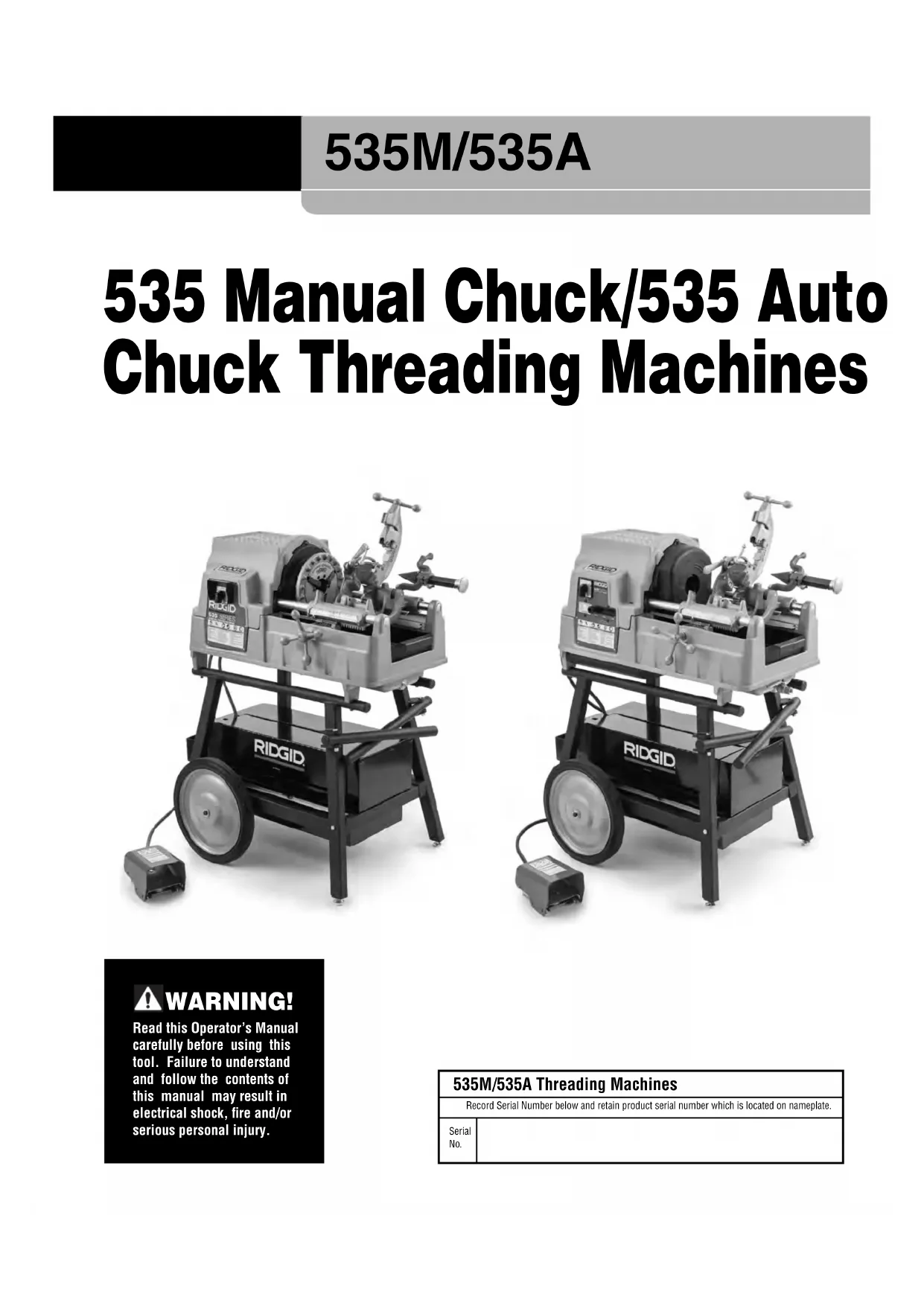 535 Manual Chuck/535 Auto Chuck Threading Machines General Power Tool Safety Warnings* WARNING Read all safety warnings, instructions, illustra- tions and specications provided with this power tool. Failure to follow all instructions listed below may result in electric shock, re and/or serious injury.