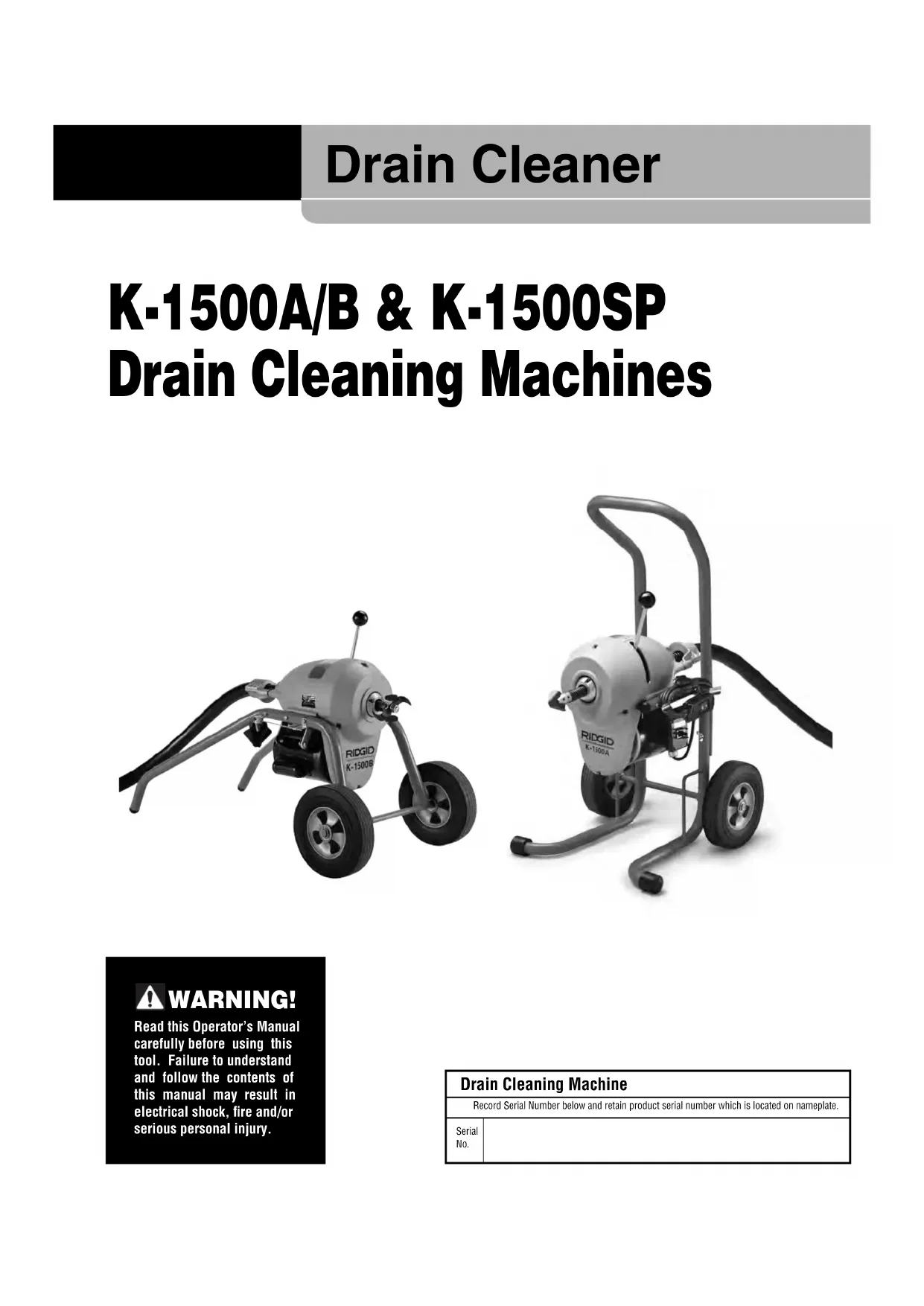 - Have your power tool serviced by a qualified repair person using only identical replacement parts. This will ensure that the safety of the power tool is main- tained. Specific Safety Information WARNING This section contains important safety informa- tion that is specific to this tool. Read these precautions carefully before using the K-1500 Drain Cleaners to reduce the risk of elec- trical shock or other serious injury.