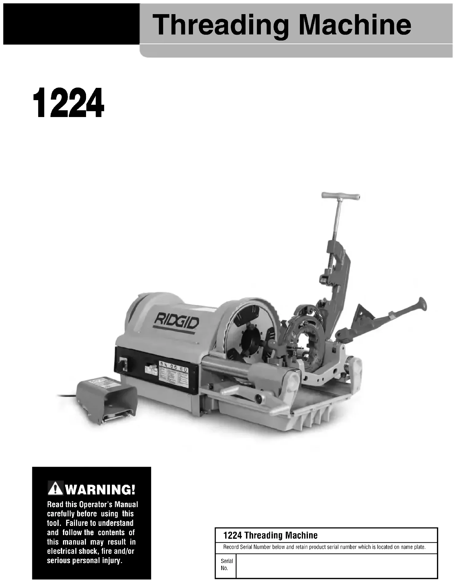 1224 Threading Machine General Power Tool Safety Warnings* WARNING Read all safety warnings, instructions, illustra- tions and specifications provided with this power tool. Failure to follow all instructions listed below may result in electric shock, fire and/or serious injury.