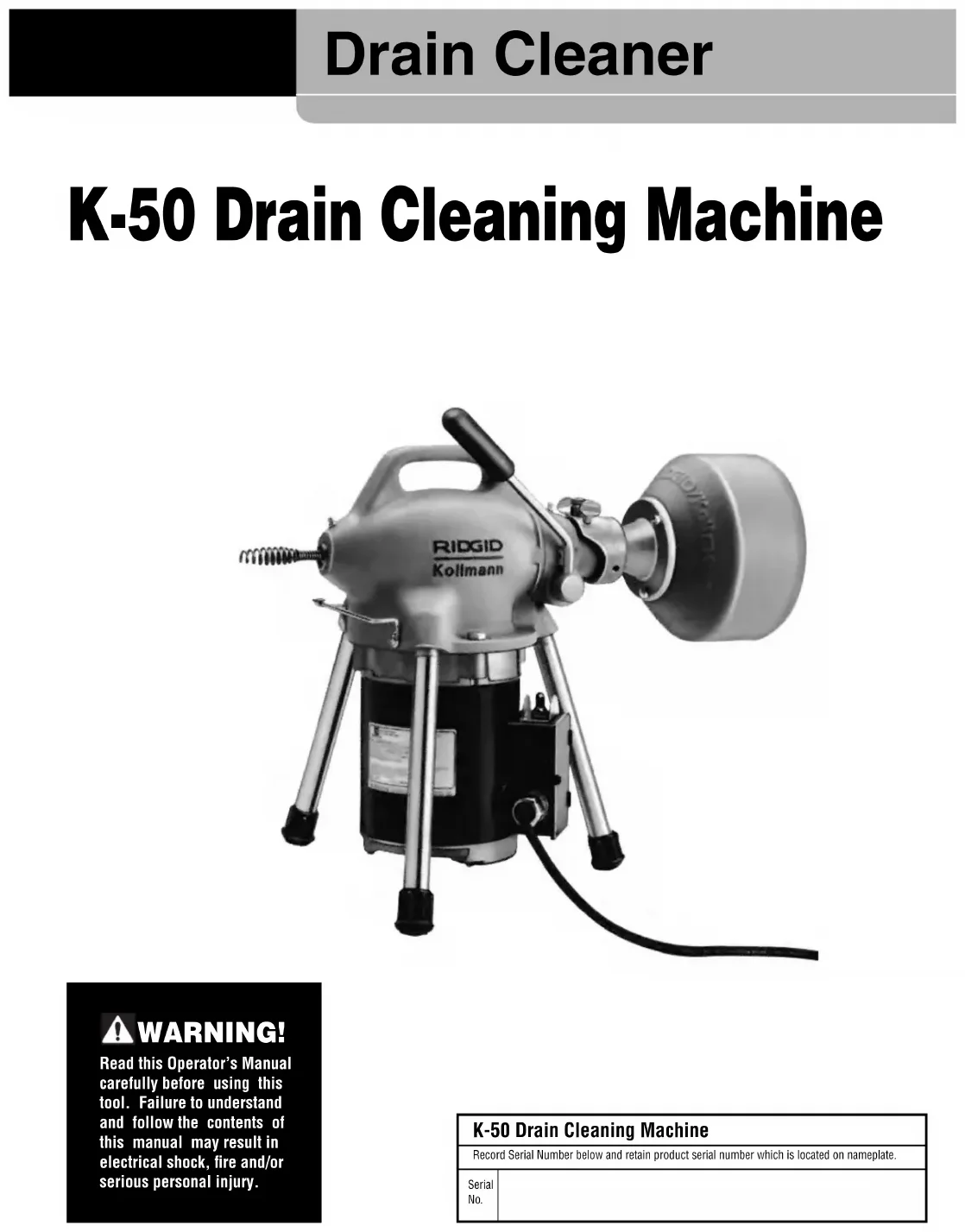 - Have your power tool serviced by a qualified repair person using only identical replacement parts. This will ensure that the safety of the power tool is main- tained. Specific Safety Information WARNING This section contains important safety informa- tion that is specific to this tool. Read these precautions carefully before using the K-50 Drain Cleaner to reduce the risk of electrical shock or other serious injury.