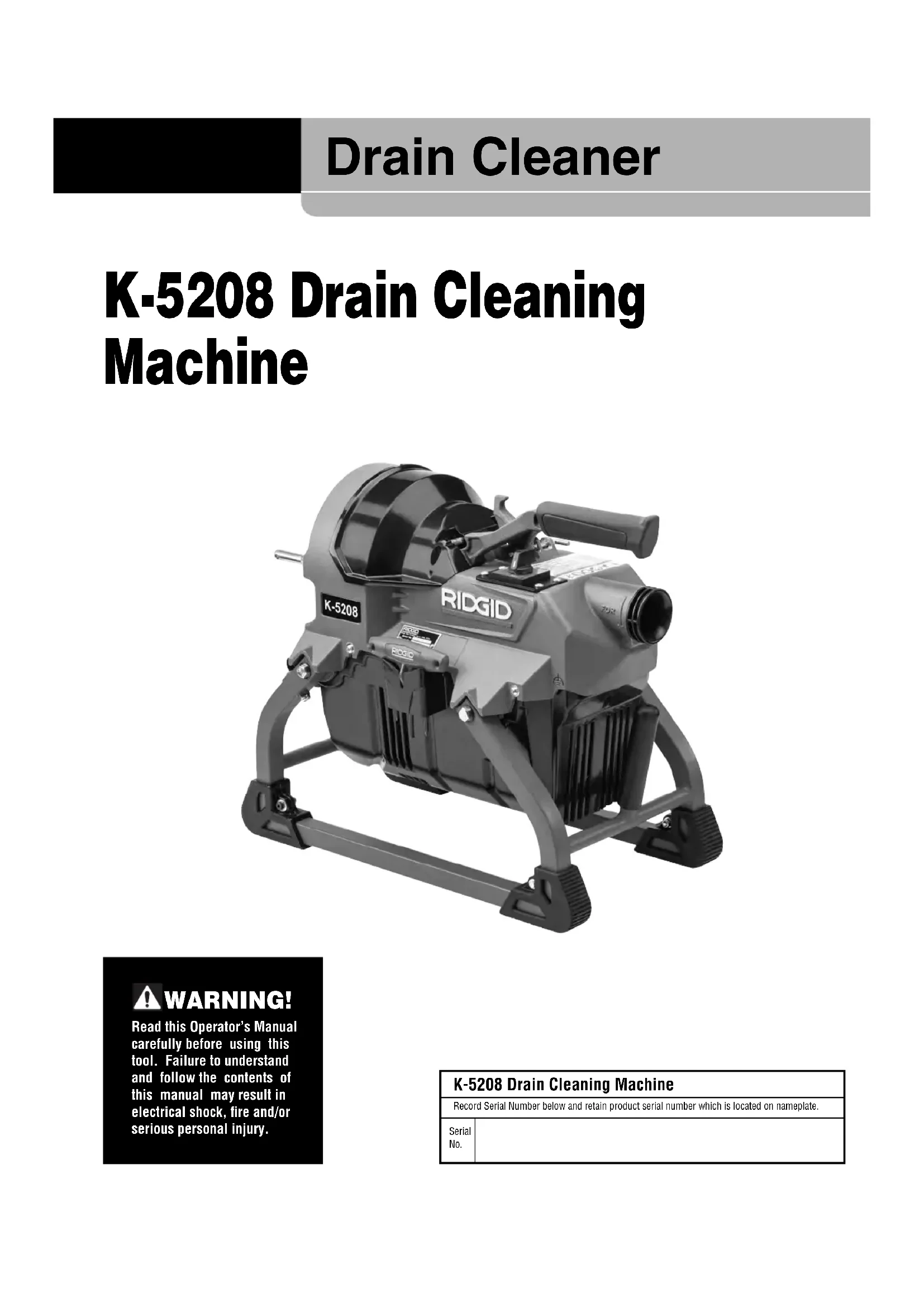 FOR FUTURE REFERENCE! Keep this manual with machine for use by the operator.999-995-137.10_REV. B4 K-5208 Drain Cleaning Machine