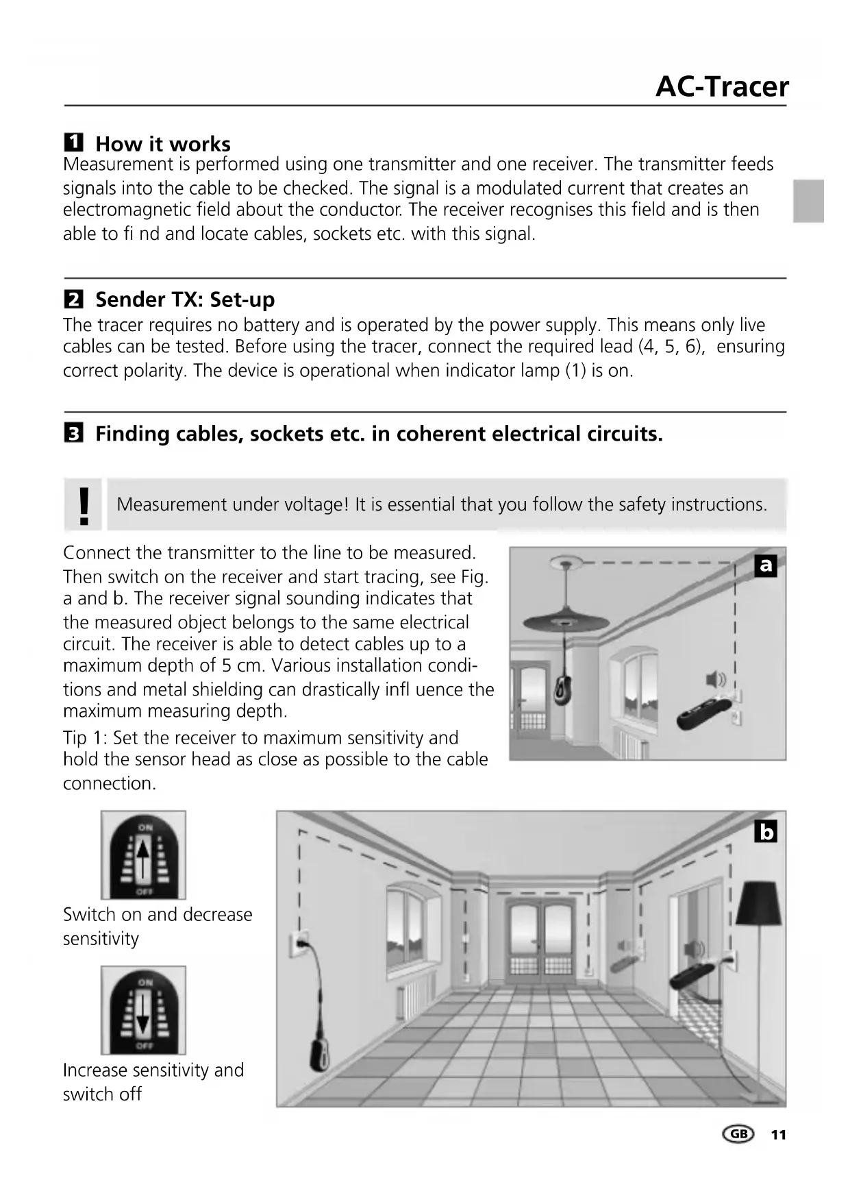 Increase sensitivity and switch off Switch on and decrease sensitivity Connect the transmitter to the line to be measured. Then switch on the receiver and start tracing, see Fig. a and b. The receiver signal sounding indicates that the measured object belongs to the same electrical circuit. The receiver is able to detect cables up to a maximum depth of 5 cm. Various installation condi- tions and metal shielding can drastically in× uence the maximum measuring depth. Tip 1: Set the receiver to maximum sensitivity and hold the sensor head as close as possible to the cable connection. Measurement under voltage! It is essential that you follow the safety instructions.