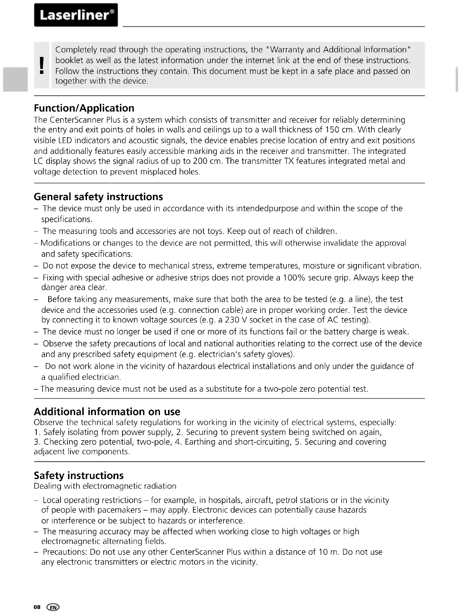 Download the instructions for your Drill in PDF format for free! Find your manual CenterScanner Plus - Laserliner and take your electronic device back in hand. On this page are published all the documents necessary for the use of your device. CenterScanner Plus by Laserliner.