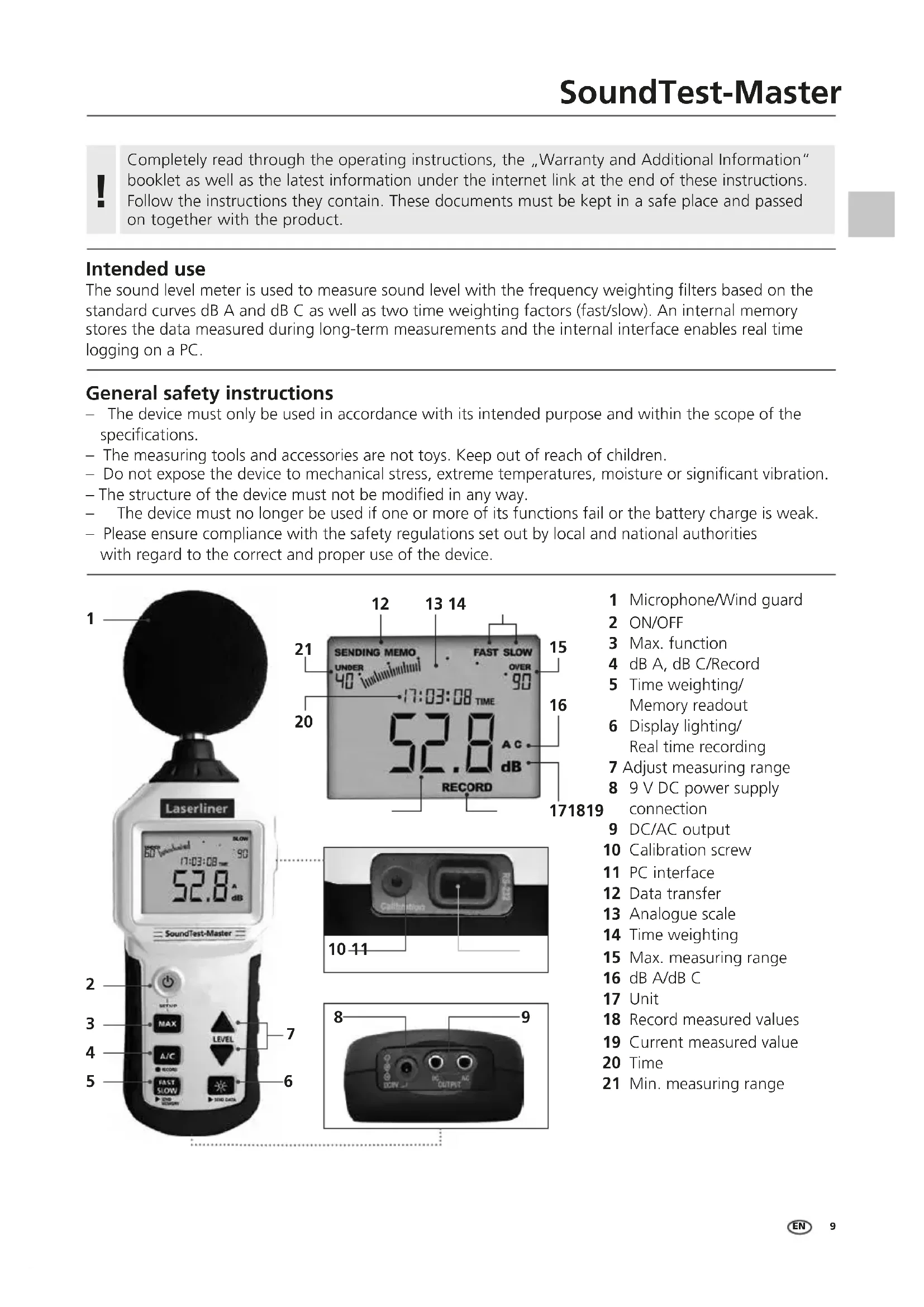 Download the instructions for your Sound level meters in PDF format for free! Find your manual SoundTestMaster - Laserliner and take your electronic device back in hand. On this page are published all the documents necessary for the use of your device. SoundTestMaster by Laserliner.
