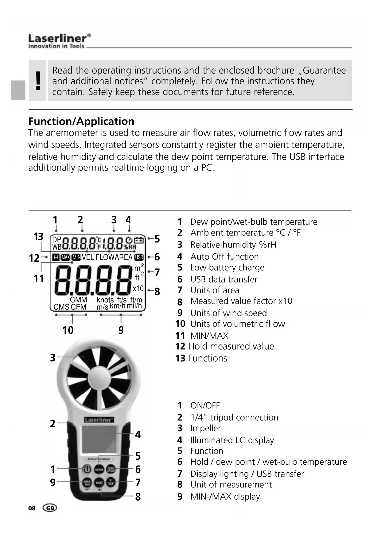 MIN/MAX 12 Hold measured value 13 Functions Function/Application The anemometer is used to measure air × ow rates, volumetric × ow rates and wind speeds. Integrated sensors constantly register the ambient temperature, relative humidity and calculate the dew point temperature. The USB interface additionally permits realtime logging on a PC. Read the operating instructions and the enclosed brochure „Guarantee and additional notices“ completely. Follow the instructions they contain. Safely keep these documents for future reference.