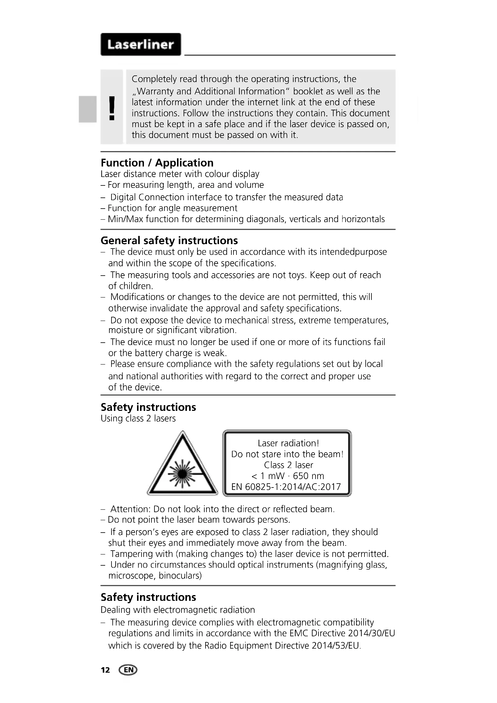 Completely read through the operating instructions, the „Warranty and Additional Information“ booklet as well as the latest information under the internet link at the end of these instructions. Follow the instructions they contain. This document must be kept in a safe place and if the laser device is passed on, this document must be passed on with it. !DistanceMaster Compact Pro