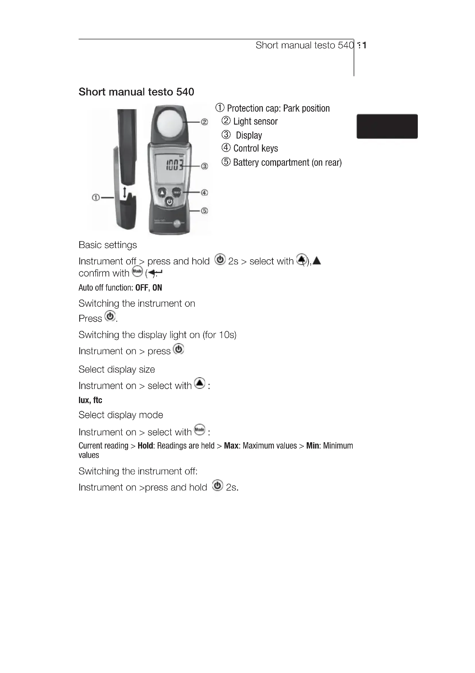 - Send the product back to Testo at the end of its useful life. We will ensure that it is disposed of in an environmentally friendly manner.Specifications 13 Specifications Functions and use The testo 540 is an illuminance measuring instrument. It is normally used to measure illuminance, e.g. at workplaces. Technical data Measurement data
