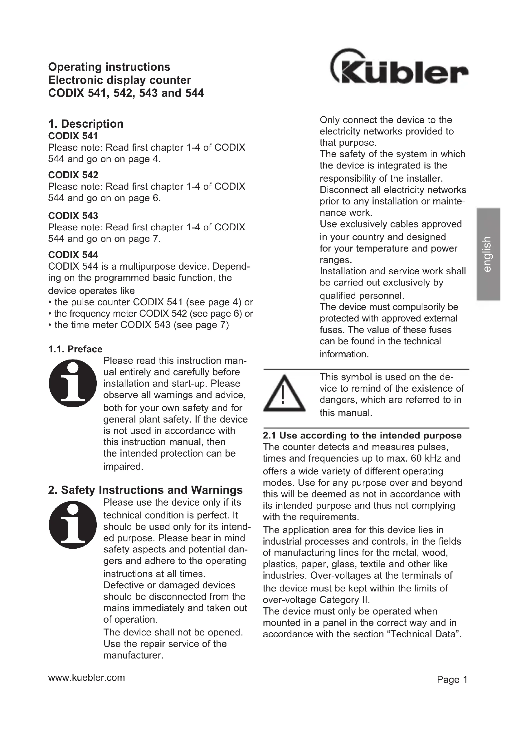 • No ground connection to the following device If, despite all, your device still does not oper- ate, contact your local representative or call us directly for technical support. When sending your device back, please attach a short description of the failure, of the programming and of the connection diagram, in order to allow us to reproduce a possibly existing defect and to repair your device as quickly as possible. englishPage 4 www.kuebler.com Pulse counter/Po si ti on indicator CODIX 541 (CODIX 544: Operating mode pulse counter)
