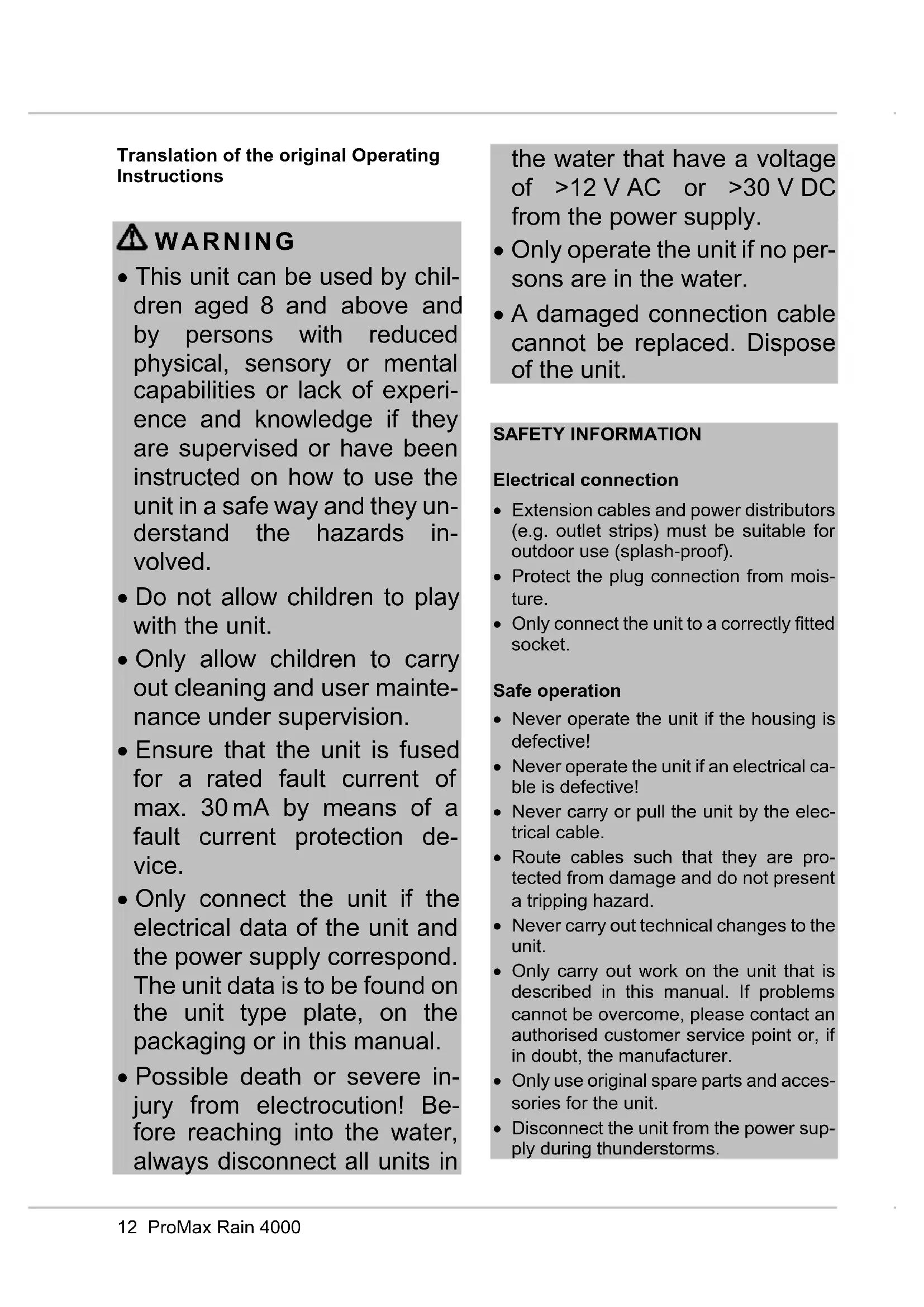 OPERATING MANUAL Welcome to OASE Living Water. You made a good choice with the purchase of this product ProMax Rain 4000. Prior to commissioning the unit, please read the instructions of use carefully and fully familiarise yourself with the unit. En- sure that all work on and with this unit is only carried out in accordance with these instructions. Adhere to the safety information for the correct and safe use of the unit. Keep these instructions in a safe place! Please also hand over the instructions when passing the unit on to a new owner. Symbols used in these instructions Warnings The warning information is categorised by signal words, which indicate the extent of the hazard. WARNING