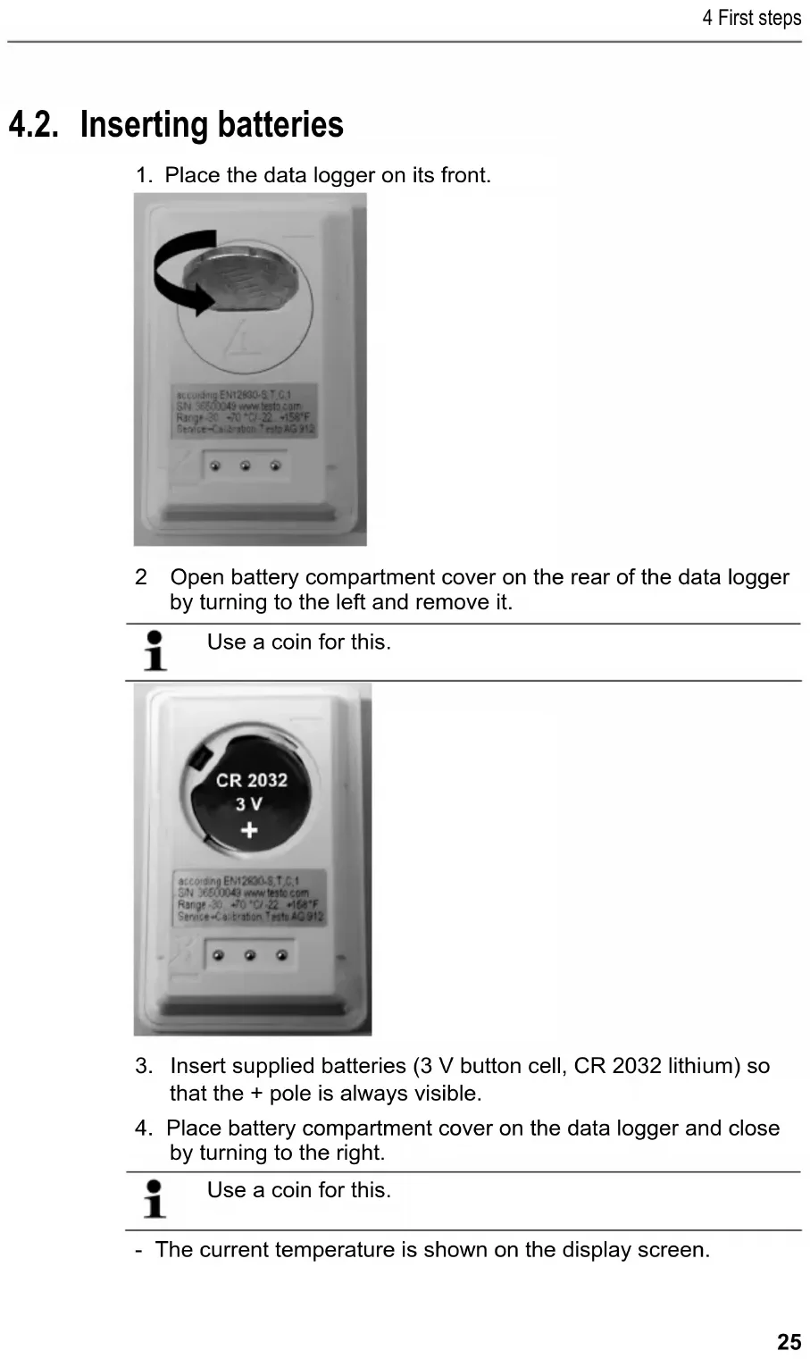 by turning to the right. Use a coin for this. - The current temperature is shown on the display screen.4 First steps