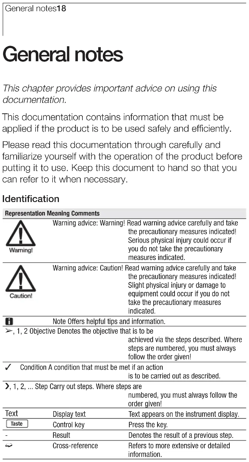 enfresitptsvnl????General notes18 General notes This chapter provides important advice on using this documentation. This documentation contains information that must be applied if the product is to be used safely and efficiently. Please read this documentation through carefully and familiarize yourself with the operation of the product before putting it to use. Keep this document to hand so that you can refer to it when necessary. Identification Representation Meaning Comments Warning advice: Warning! Read warning advice carefully and take the precautionary measures indicated! Serious physical injury could occur if you do not take the precautionary measures indicated. Warning advice: Caution! Read warning advice carefully and take the precautionary measures indicated! Slight physical injury or damage to equipment could occur if you do not take the precautionary measures indicated. Note Offers helpful tips and information. ±, 1, 2 Objective Denotes the objective that is to be achieved via the steps described. Where steps are numbered, you must always follow the order given! Condition A condition that must be met if an action is to be carried out as described. i, 1, 2, ... Step Carry out steps. Where steps are numbered, you must always follow the order given! Text Display text Text appears on the instrument display. Control key Press the key. - Result Denotes the result of a previous step. º Cross-reference Refers to more extensive or detailed information. Taste1. Safety instructions 19