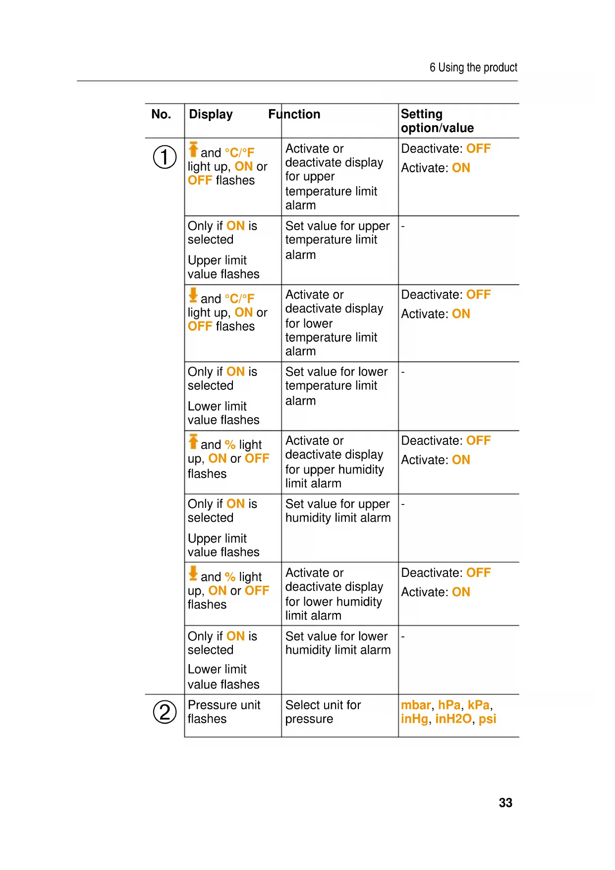 No. Display Function Setting option/value Altitude lights up, height unit flashes Select unit for height above sea level m, ft 2 flashes Set value for height above sea level For unit in m: 0 to 9000 m For unit in ft: 0 to 29,527 ft