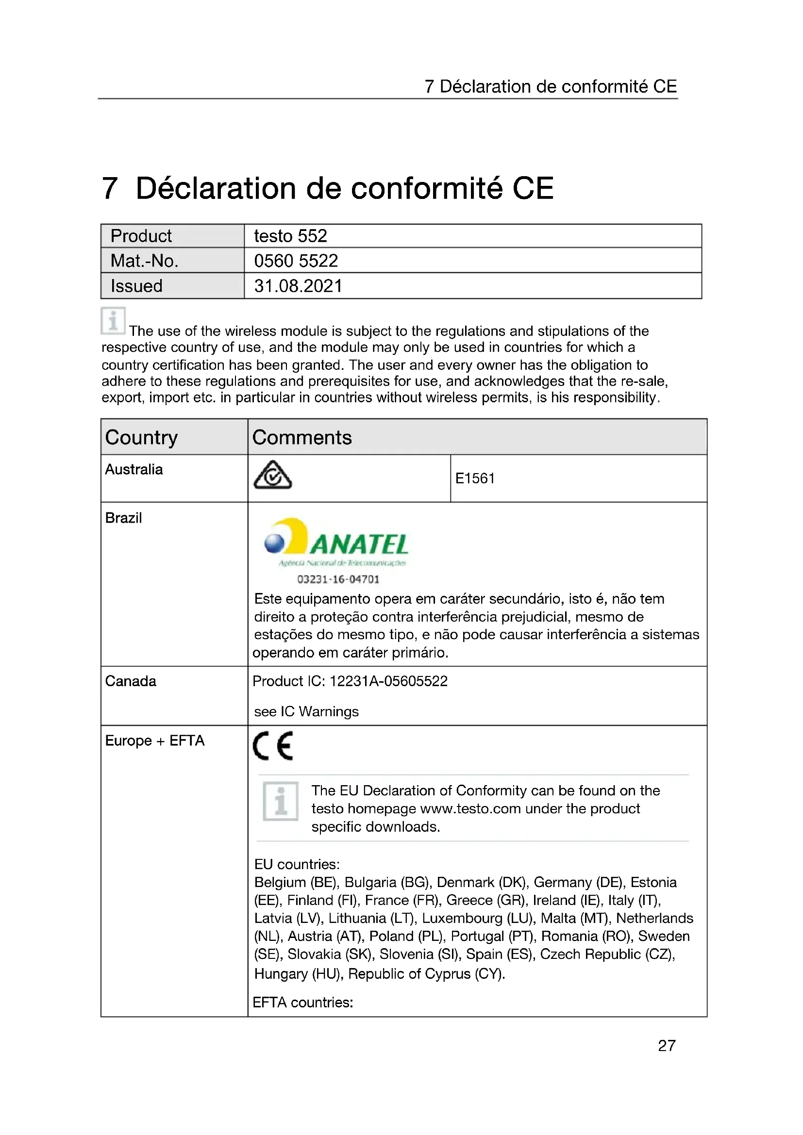 The EU Declaration of Conformity can be found on the testo homepage www.testo.com under the product specific downloads. EU countries: Belgium (BE), Bulgaria (BG), Denmark (DK), Germany (DE), Estonia (EE), Finland (FI), France (FR), Greece (GR), Ireland (IE), Italy (IT), Latvia (LV), Lithuania (LT), Luxembourg (LU), Malta (MT), Netherlands (NL), Austria (AT), Poland (PL), Portugal (PT), Romania (RO), Sweden (SE), Slovakia (SK), Slovenia (SI), Spain (ES), Czech Republic (CZ), Hungary (HU), Republic of Cyprus (CY). EFTA countries:7 Déclaration de conformité CE