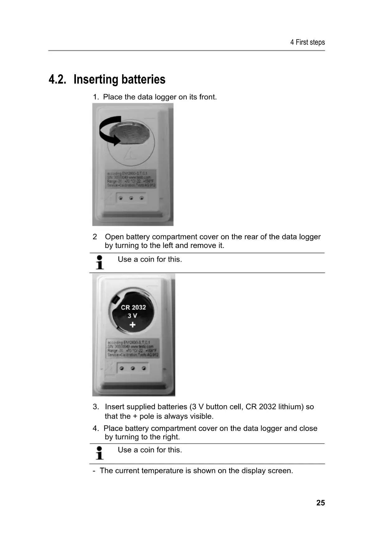 by turning to the right. Use a coin for this. - The current temperature is shown on the display screen.4 First steps