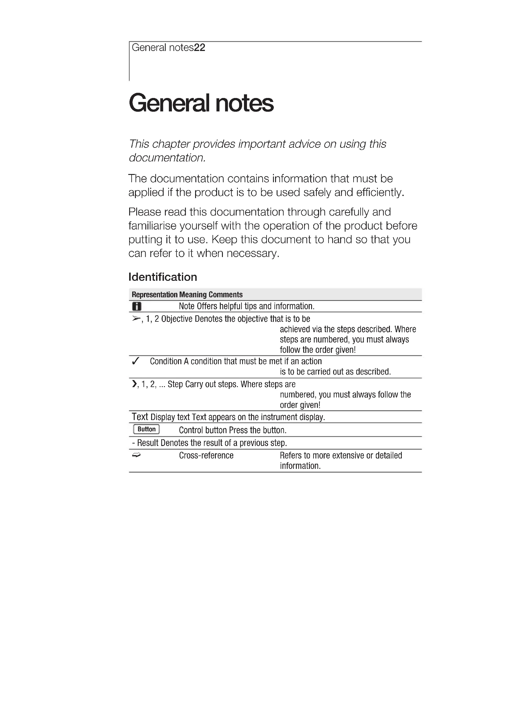 testo 512 Digital manometerGeneral notes22 General notes This chapter provides important advice on using this documentation. The documentation contains information that must be applied if the product is to be used safely and efficiently. Please read this documentation through carefully and familiarise yourself with the operation of the product before putting it to use. Keep this document to hand so that you can refer to it when necessary. Identification Representation Meaning Comments Note Offers helpful tips and information. ±, 1, 2 Objective Denotes the objective that is to be achieved via the steps described. Where steps are numbered, you must always follow the order given! Condition A condition that must be met if an action is to be carried out as described. i, 1, 2, ... Step Carry out steps. Where steps are numbered, you must always follow the order given! Text Display text Text appears on the instrument display. Control button Press the button. - Result Denotes the result of a previous step. º Cross-reference Refers to more extensive or detailed information. Button1. Safety advice 23