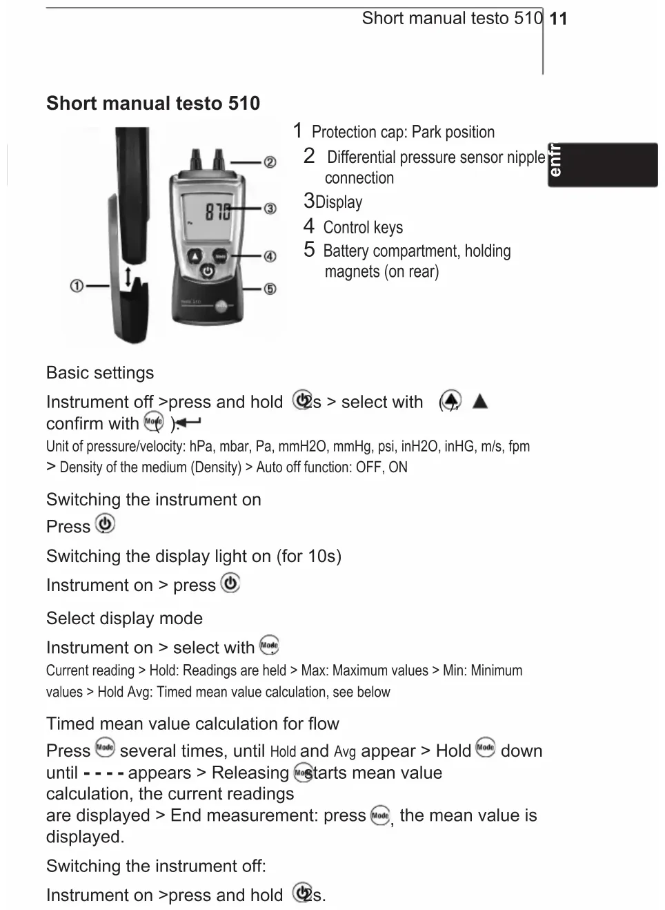 Short manual testo 510 1 Protection cap: Park position 2 Differential pressure sensor nipple connection 3 Display 4 Control keys 5 Battery compartment, holding magnets (on rear) Basic settings Instrument off >press and hold 2s > select with ( ), confirm with ( ): Unit of pressure/velocity: hPa, mbar, Pa, mmH2O, mmHg, psi, inH2O, inHG, m/s, fpm > Density of the medium (Density) > Auto off function: OFF, ON Switching the instrument on Press . Switching the display light on (for 10s) Instrument on > press Select display mode Instrument on > select with : Current reading > Hold: Readings are held > Max: Maximum values > Min: Minimum values > Hold Avg: Timed mean value calculation, see below Timed mean value calculation for flow Press several times, until Hold and Avg appear > Hold down until - - - - appears > Releasing starts mean value calculation, the current readings are displayed > End measurement: press
