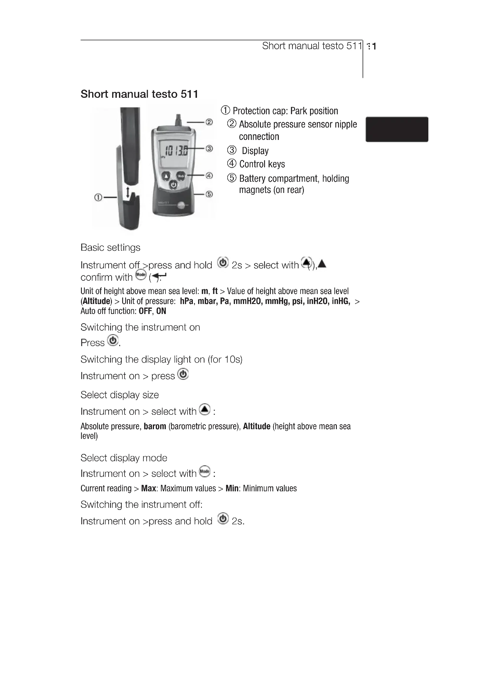 Current reading > Max: Maximum values > Min: Minimum values Switching the instrument off: Instrument on >press and hold 2s. deenfresitptsvnl???? Short manual testo 51112 Safety and the environment About this document > Please read this documentation through carefully and familiarise yourself with the product before putting it to use. Keep this document to hand so that you can refer to it when necessary. Hand this documentation on to any subsequent users of the product. > Pay particular attention to information emphasised by the following symbols: Important. Avoid personal injury/damage to equipment > Only operate the measuring instrument properly, for its intended purpose and within the parameters specified in the technical data. Do not use force. > Never store the product together with solvents, acids or other aggressive substances. > Only carry out the maintenance and repair work that is described in the documentation. Follow the prescribed steps when doing so. Use only OEM spare parts from Testo. Magnetic field May be harmful to those with pacemakers. > Keep a minimum distance of 10 cm between pacemaker and instrument. Magnetic field Damage to other devices! > Keep a safe distance away from products which could be damaged by the effects of magnetism (e.g. monitors, computers or credit cards). Protecting the environment > Take faulty rechargeable batteries as well as spent batteries to the collection points provided for them. > Send the product back to Testo at the end of its useful life. We will ensure that it is disposed of in an environmentally friendly manner. Safety and the enviroment13 Specifications Functions and use The testo 511 is an absolute pressure measuring instrument. It is normally used to measure absolute pressure, e.g. for pressure compensation in velocity measurement in ducts, laboratories and production processes. Further measurement parameters are barometric (surface) pressure (= pressure at sea level) and altitude above sea level. Technical data Measurement data