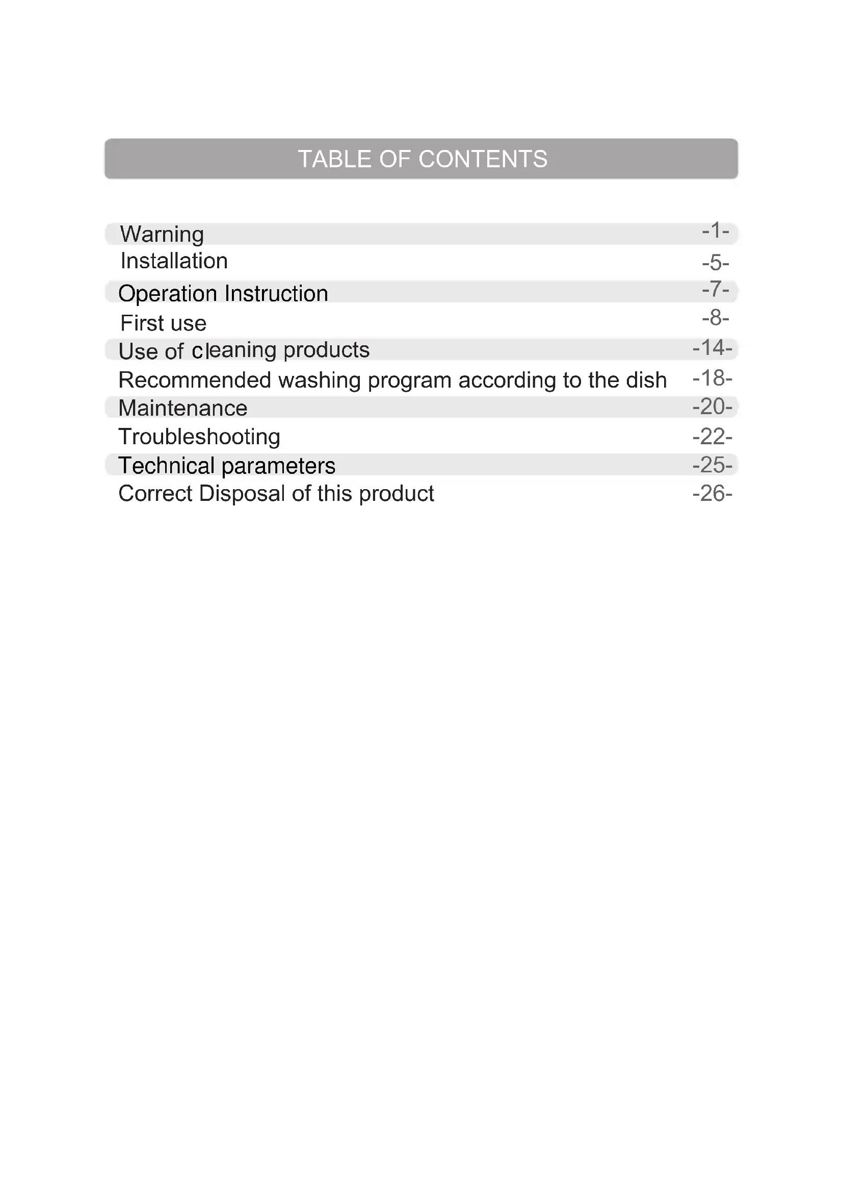 Warning Installation First use Recommended washing program according to the dish Maintenance Troubleshooting Operation Instruction