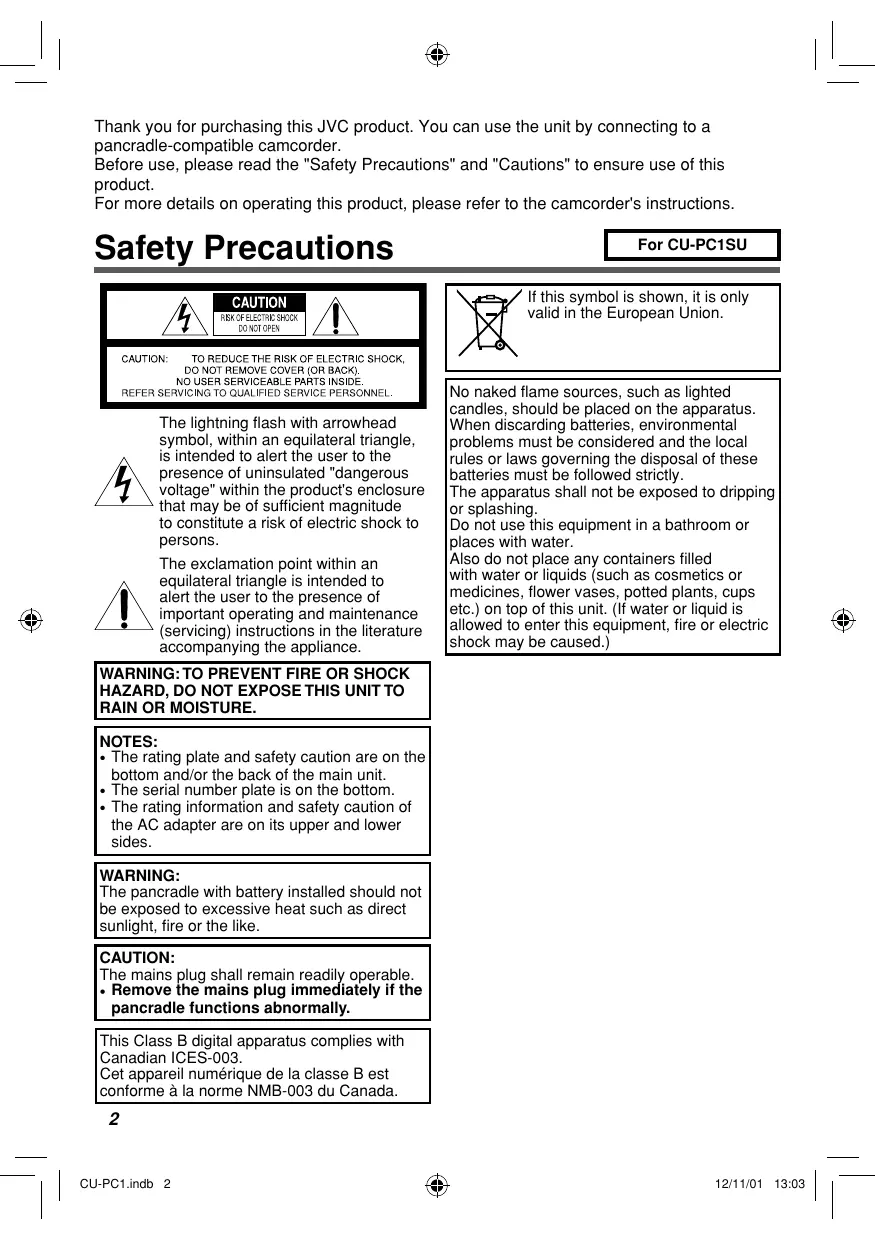 • To prevent shock, do not open the cabinet. No user serviceable parts inside. Refer servicing to qualified personnel. • When you are not using the AC adapter for a long period of time, it is recommended that you disconnect the power cord from AC outlet. NOTES: • The rating plate and safety caution are on the bottom and/or the back of the main unit. • The serial number plate is on the bottom. • The rating information and safety caution of the AC adapter are on its upper and lower sides. WARNING: The pancradle with battery installed should not be exposed to excessive heat such as direct sunlight, fire or the like. CAUTION: The mains plug shall remain readily operable. • Remove the mains plug immediately if the pancradle functions abnormally. CAUTIONS: • Be sure to use the supplied AC adapter. • Do not use the supplied AC adapter with other devices. No naked flame sources, such as lighted candles, should be placed on the apparatus. When discarding batteries, environmental problems must be considered and the local rules or laws governing the disposal of these batteries must be followed strictly. The apparatus shall not be exposed to dripping or splashing. Do not use this equipment in a bathroom or places with water. Also do not place any containers filled with water or liquids (such as cosmetics or medicines, flower vases, potted plants, cups etc.) on top of this unit. (If water or liquid is allowed to enter this equipment, fire or electric shock may be caused.)