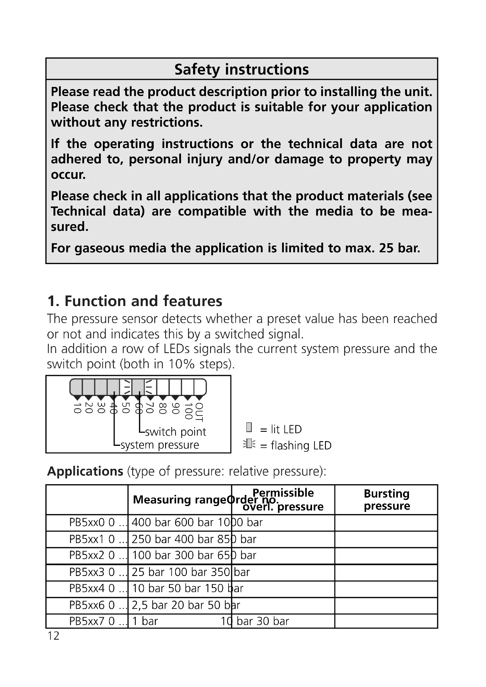 - ,5 bar 20 bar 50 bar PB5xx7 0 bar 10 bar 30 bar Safety instructions Please read the product description prior to installing the unit. Please check that the product is suitable for your application without any restrictions. If the operating instructions or the technical data are not adhered to, personal injury and/or damage to property may occur. Please check in all applications that the product materials (see Technical data) are compatible with the media to be mea- sured. For gaseous media the application is limited to max. 25 bar.Avoid static and dynamic overpressure exceeding the given over- load pressure. Even if the bursting pressure is exceeded only for a short time the unit can be destroyed (danger of injuries)! Indication of the current system pressure as from 5% of the value of the measuring range. “All LEDs OUT” does not mean that the system is free of pressure! The unit p. 1