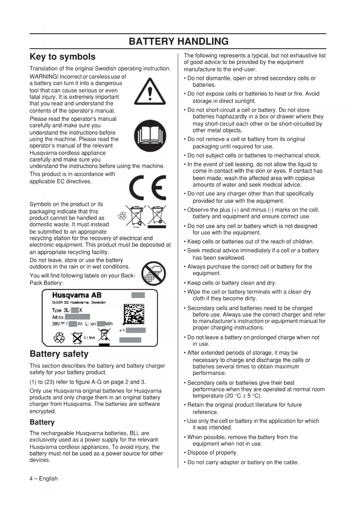 19BATTERY HANDLING 4 – English Key to symbols Translation of the original Swedish operating instruction. WARNING! Incorrect or careless use of a battery can turn it into a dangerous tool that can cause serious or even fatal injury. It is extremely important that you read and understand the contents of the operator's manual. Please read the operator’s manual carefully and make sure you understand the instructions before using the machine. Please read the operator’s manual of the relevant Husqvarna cordless appliance carefully and make sure you understand the instructions before using the machine. This product is in accordance with applicable EC directives. Symbols on the product or its packaging indicate that this product cannot be handled as domestic waste. It must instead be submitted to an appropriate recycling station for the recovery of electrical and electronic equipment. This product must be deposited at an appropriate recycling facility. Do not leave, store or use the battery outdoors in the rain or in wet conditions. You will find following labels on your Back- Pack Battery: Battery safety This section describes the battery and battery charger safety for your battery product. (1) to (23) refer to figure A-G on page 2 and 3. Only use Husqvarna original batteries for Husqvarna products and only charge them in an original battery charger from Husqvarna. The batteries are software encrypted. Battery The rechargeable Husqvarna batteries, BLi, are exclusively used as a power supply for the relevant Husqvarna cordless appliances. To avoid injury, the battery must not be used as a power source for other devices. The following represents a typical, but not exhaustive list of good advice to be provided by the equipment manufacture to the end-user.