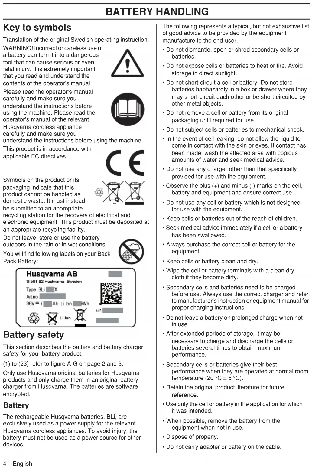 19BATTERY HANDLING 4 – English Key to symbols Translation of the original Swedish operating instruction. WARNING! Incorrect or careless use of a battery can turn it into a dangerous tool that can cause serious or even fatal injury. It is extremely important that you read and understand the contents of the operator's manual. Please read the operator’s manual carefully and make sure you understand the instructions before using the machine. Please read the operator’s manual of the relevant Husqvarna cordless appliance carefully and make sure you understand the instructions before using the machine. This product is in accordance with applicable EC directives. Symbols on the product or its packaging indicate that this product cannot be handled as domestic waste. It must instead be submitted to an appropriate recycling station for the recovery of electrical and electronic equipment. This product must be deposited at an appropriate recycling facility. Do not leave, store or use the battery outdoors in the rain or in wet conditions. You will find following labels on your Back- Pack Battery: Battery safety This section describes the battery and battery charger safety for your battery product. (1) to (23) refer to figure A-G on page 2 and 3. Only use Husqvarna original batteries for Husqvarna products and only charge them in an original battery charger from Husqvarna. The batteries are software encrypted. Battery The rechargeable Husqvarna batteries, BLi, are exclusively used as a power supply for the relevant Husqvarna cordless appliances. To avoid injury, the battery must not be used as a power source for other devices. The following represents a typical, but not exhaustive list of good advice to be provided by the equipment manufacture to the end-user.