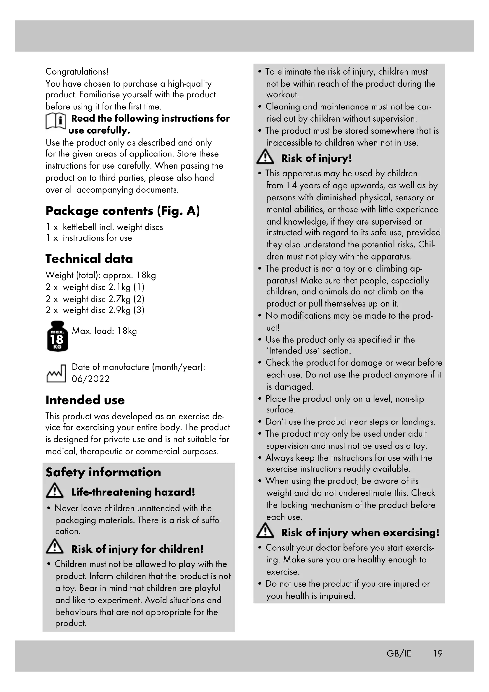 Max. load: 18kg Date of manufacture (month/year): 06/2022 Intended use This product was developed as an exercise de- vice for exercising your entire body. The product is designed for private use and is not suitable for medical, therapeutic or commercial purposes. Safety information Life-threatening hazard!