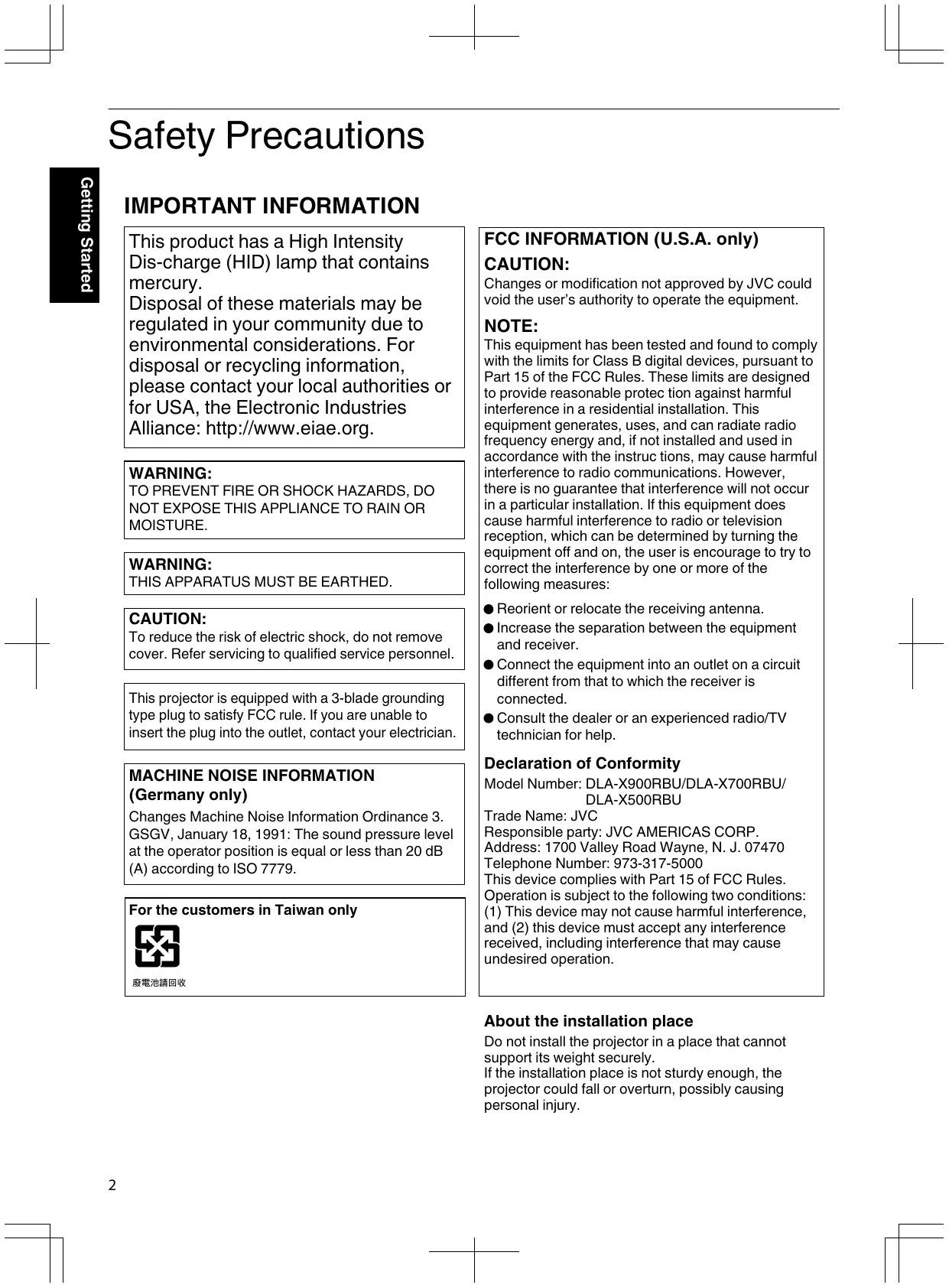 Model Number: DLA-X900RBU/DLA-X700RBU/ DLA-X500RBU Trade Name: JVC Responsible party: JVC AMERICAS CORP. Address: 1700 Valley Road Wayne, N. J. 07470 Telephone Number: 973-317-5000 This device complies with Part 15 of FCC Rules. Operation is subject to the following two conditions: (1) This device may not cause harmful interference, and (2) this device must accept any interference received, including interference that may cause undesired operation.
