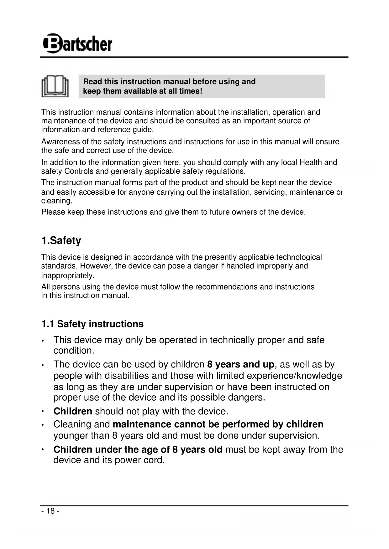 Read this instruction manual before using and keep them available at all times! This instruction manual contains information about the installation, operation and maintenance of the device and should be consulted as an important source of information and reference guide. Awareness of the safety instructions and instructions for use in this manual will ensure the safe and correct use of the device. In addition to the information given here, you should comply with any local Health and safety Controls and generally applicable safety regulations. The instruction manual forms part of the product and should be kept near the device and easily accessible for anyone carrying out the installation, servicing, maintenance or cleaning. Please keep these instructions and give them to future owners of the device.