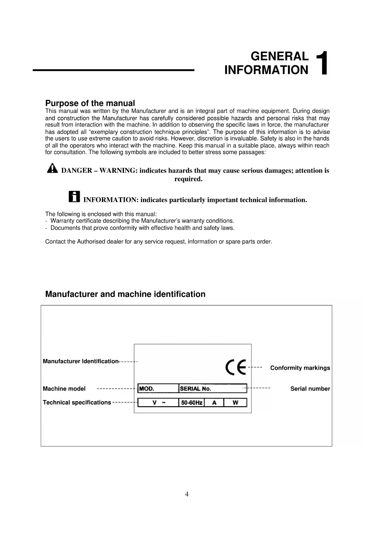 Purpose of the manual This manual was written by the Manufacturer and is an integral part of machine equipment. During design and construction the Manufacturer has carefully considered possible hazards and personal risks that may result from interaction with the machine. In addition to observing the specific laws in force, the manufacturer has adopted all “exemplary construction technique principles”. The purpose of this information is to advise the users to use extreme caution to avoid risks. However, discretion is invaluable. Safety is also in the hands of all the operators who interact with the machine. Keep this manual in a suitable place, always within reach for consultation. The following symbols are included to better stress some passages: DANGER – WARNING: indicates hazards that may cause serious damages; attention is required. INFORMATION: indicates particularly important technical information. The following is enclosed with this manual: - Warranty certificate describing the Manufacturer’s warranty conditions. - Documents that prove conformity with effective health and safety laws. Contact the Authorised dealer for any service request, information or spare parts order. Manufacturer and machine identification Manufacturer Identification Machine model Technical specifications Conformity markings Serial number5 GENERAL INFORMATION