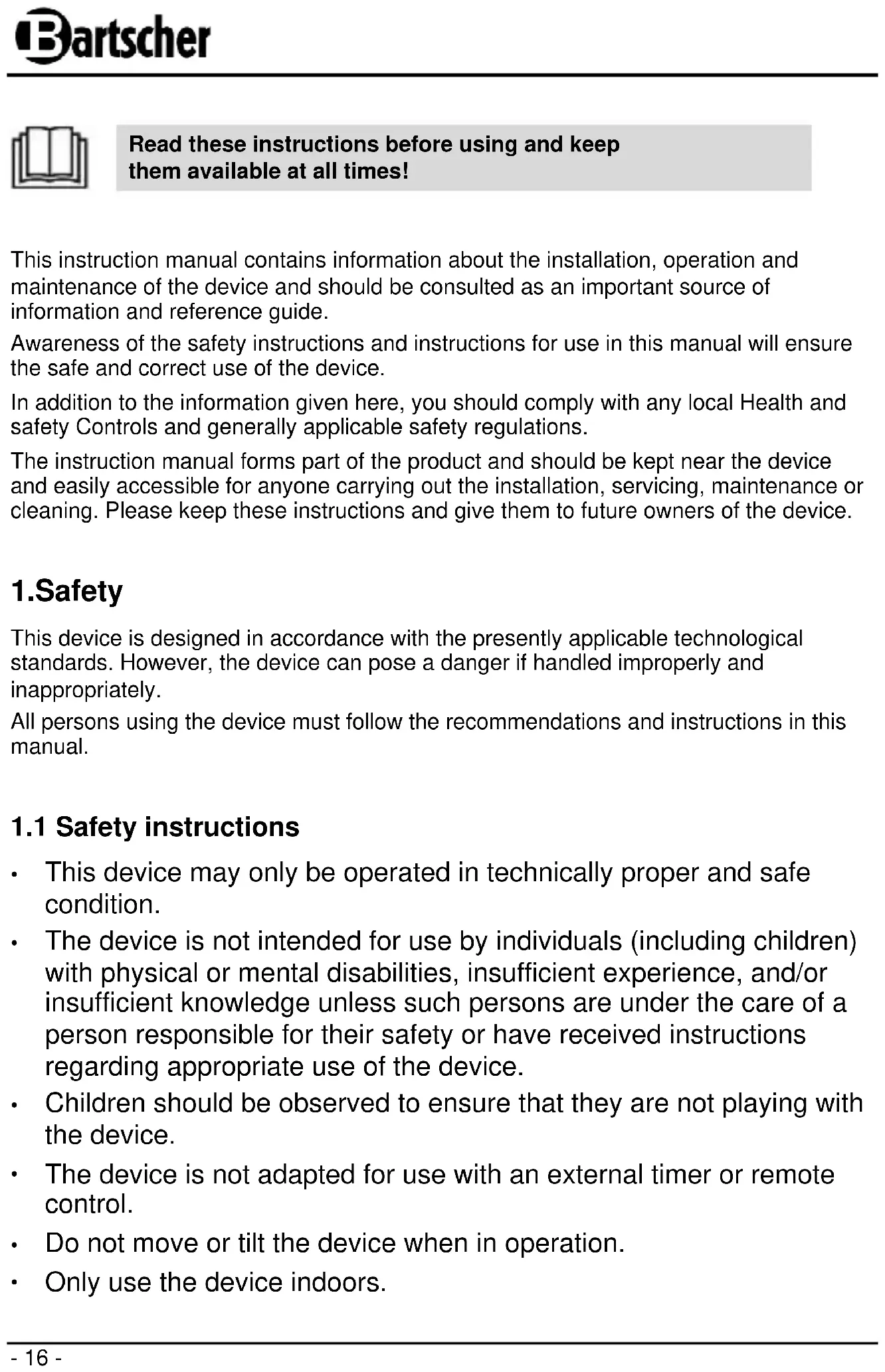 USER MANUAL 109470 BARTSCHER