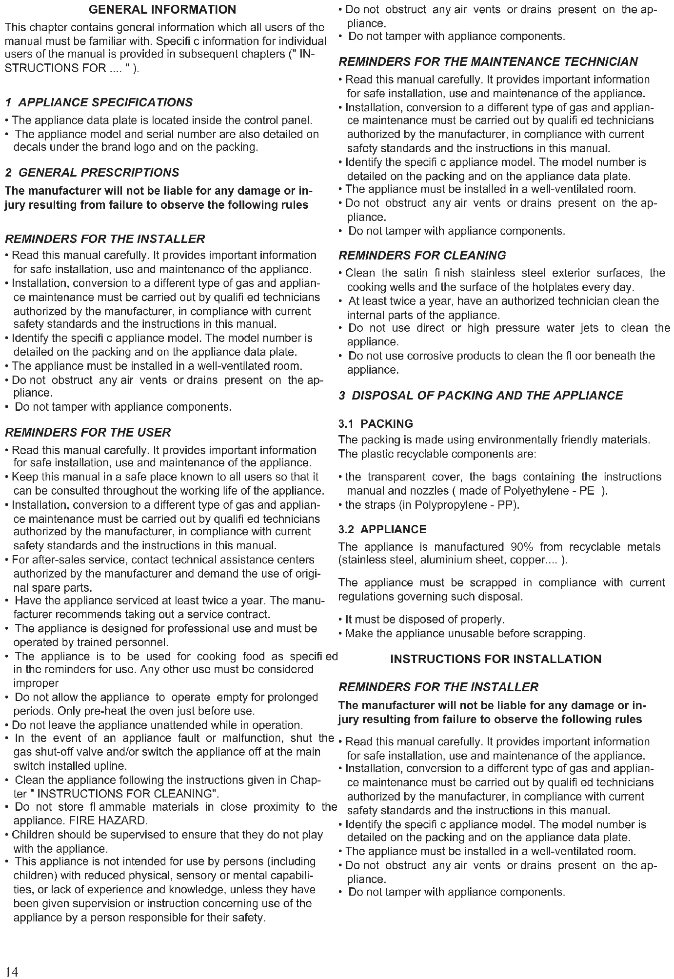 - The appliance model and serial number are also detailed on decals under the brand logo and on the packing. 2 GENERAL PRESCRIPTIONS The manufacturer will not be liable for any damage or in- jury resulting from failure to observe the following rules