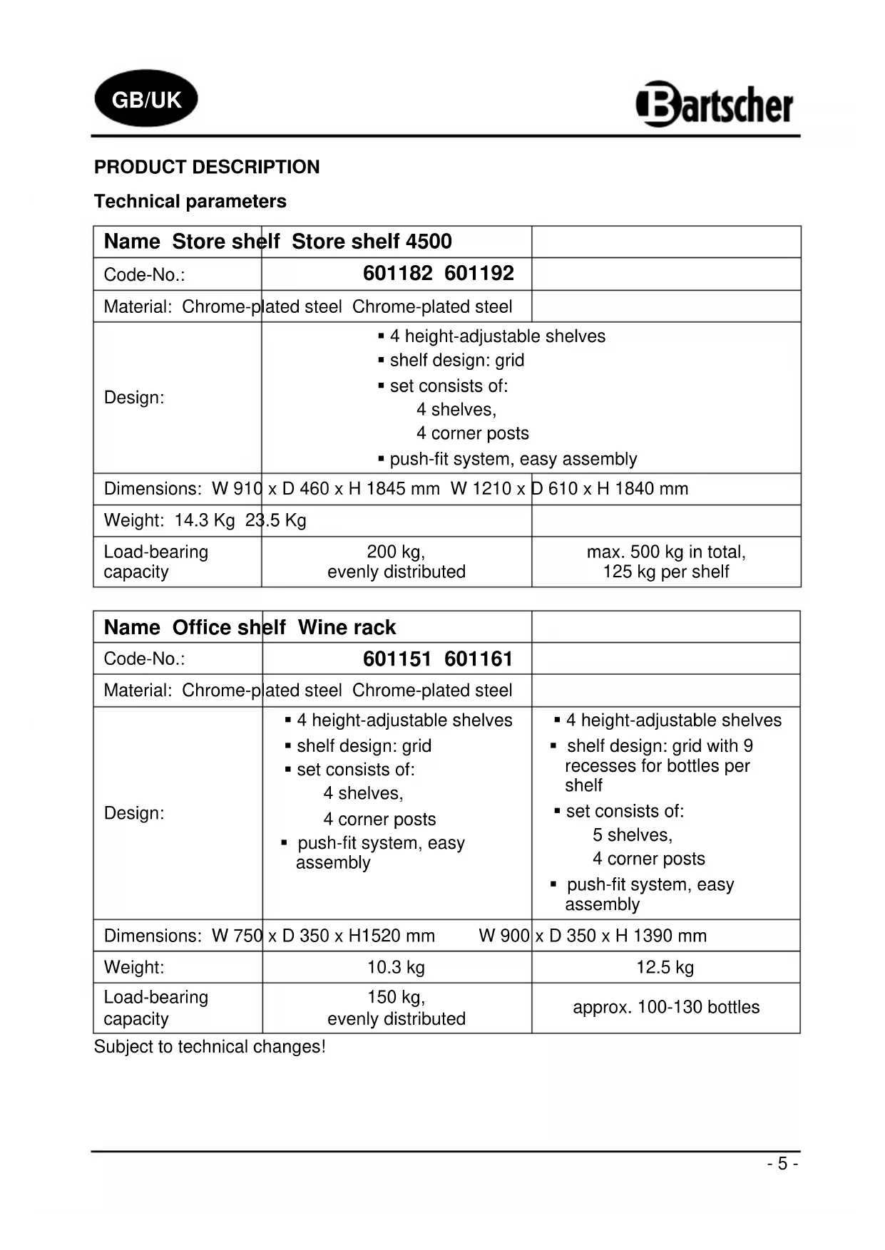 Material: Chrome-plated steel Chrome-plated steel Design: 4 height-adjustable shelves shelf design: grid set consists of: 4 shelves, 4 corner posts push-fit system, easy assembly Dimensions: W 910 x D 460 x H 1845 mm W 1210 x D 610 x H 1840 mm Weight: 14.3 Kg 23.5 Kg Load-bearing capacity 200 kg, evenly distributed max. 500 kg in total, 125 kg per shelf Name Office shelf Wine rack Code-No.: