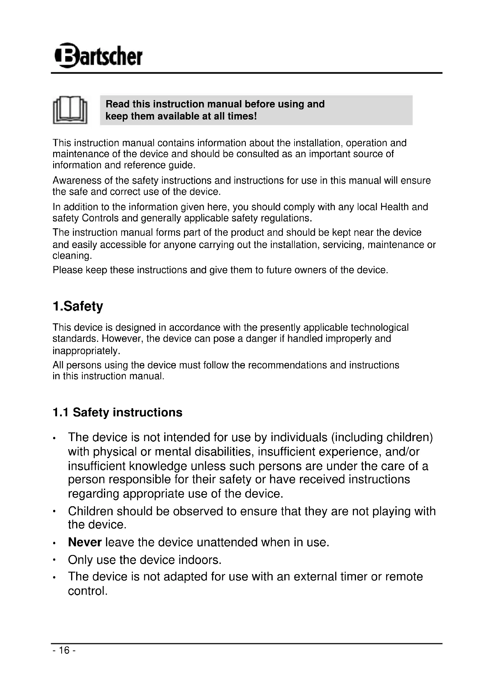 Read this instruction manual before using and keep them available at all times! This instruction manual contains information about the installation, operation and maintenance of the device and should be consulted as an important source of information and reference guide. Awareness of the safety instructions and instructions for use in this manual will ensure the safe and correct use of the device. In addition to the information given here, you should comply with any local Health and safety Controls and generally applicable safety regulations. The instruction manual forms part of the product and should be kept near the device and easily accessible for anyone carrying out the installation, servicing, maintenance or cleaning. Please keep these instructions and give them to future owners of the device.