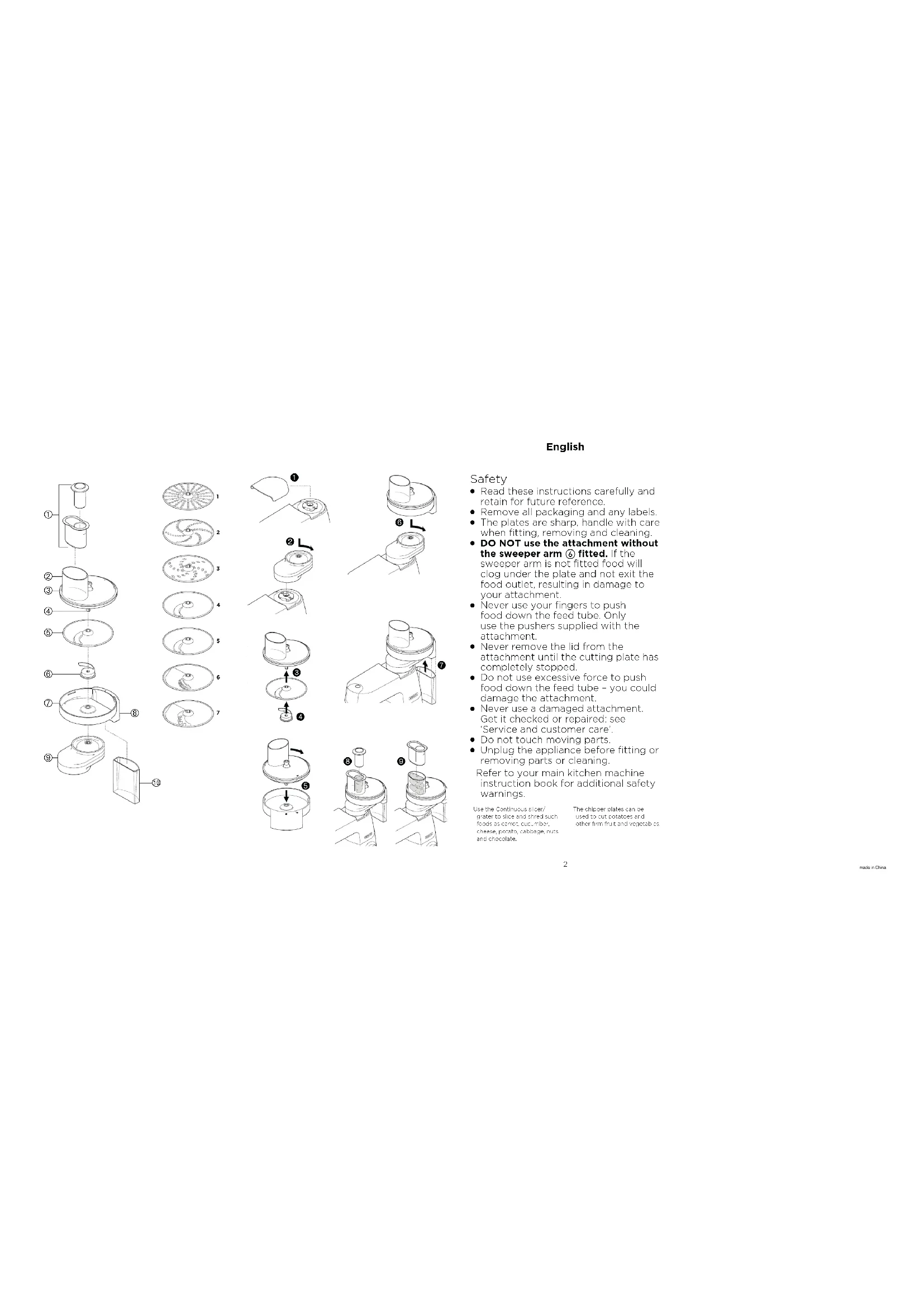 Extension chute The cutting plates available The range of plates listed below are included in pack and can be identified by the numbers marked on the plate as follows:- Plate No 1 - extra fine shredding. For parmesan cheese, chocolate and nuts eg hazelnuts. Plate No 2 - fine shredding. For cheese, chocolate, nuts and firm fruit or vegetables. Plate No 3 - coarse shredding. For cheese and firm fruit or vegetables. Plate No 4 - thin slice. For cheese and firm fruit or vegetables. Plate No 5 - thick slice. For cheese and firm fruit or vegetables Plate No 6 - thin (julienne style) chipper. Cuts potatoes for super thin French Fries and ingredients for salads, casseroles and stir fries (eg carrot, courgette and cucumber) Plate No 7 - standard chipper. Cuts potatoes for thin French Fries and ingredients for casseroles and dips (eg cucumber, apple and pear.) Assembly and use 1 Remove the high speed outlet cover