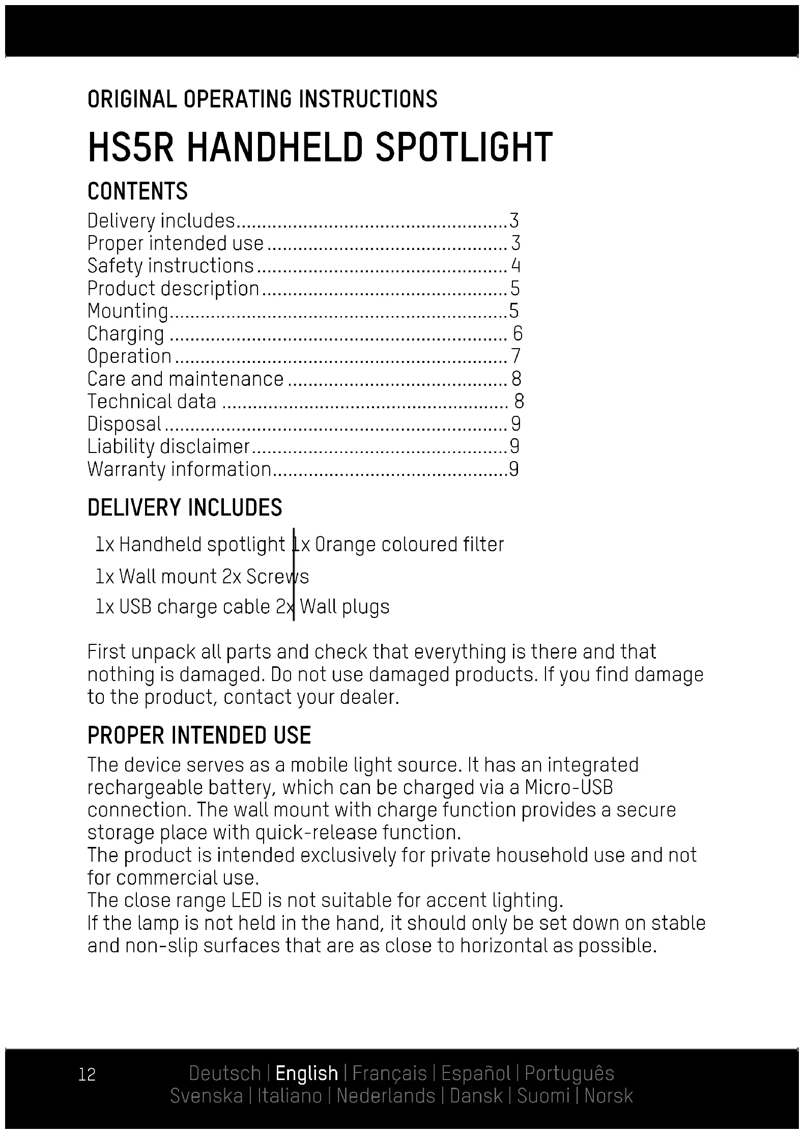 The device serves as a mobile light source. It has an integrated rechargeable battery, which can be charged via a Micro-USB connection. The wall mount with charge function provides a secure storage place with quick-release function. The product is intended exclusively for private household use and not for commercial use. The close range LED is not suitable for accent lighting. If the lamp is not held in the hand, it should only be set down on stable and non-slip surfaces that are as close to horizontal as possible. Deutsch | English | Français | Español | Português Svenska | Italiano | Nederlands | Dansk | Suomi | Norsk13 SAFETY INSTRUCTIONS Read through the complete operating instructions carefully before using the product for the first time. They contain impor- tant information for handling the product. If you pass on the product to third parties, pass on these operating instructions as well.