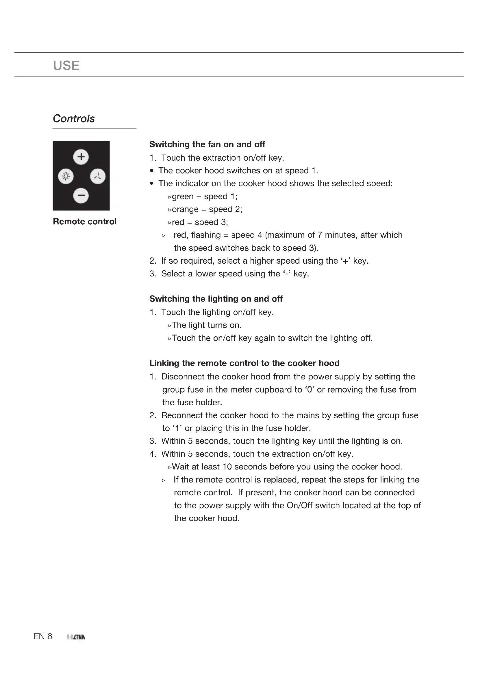 ▷ Wait at least 10 seconds before you using the cooker hood. ▷ If the remote control is replaced, repeat the steps for linking the remote control. If present, the cooker hood can be connected to the power supply with the On/Off switch located at the top of the cooker hood. USE Remote controlEN 7 Entering a new code for the cooker hood When interference prevents the remote control from working properly, a new code can be entered.