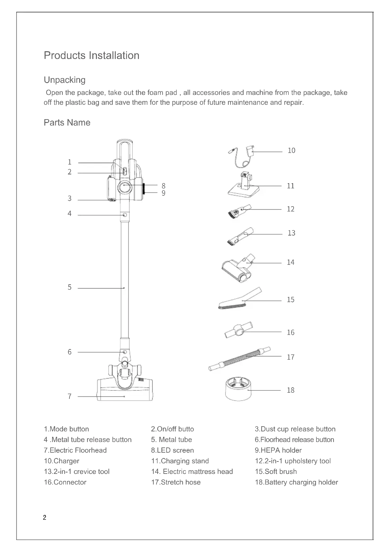Packing List Product assembly and disassembly Assemble the electric oorhead and metal tube When connecting, hold the electric oorhead with your left hand in the direction shown, use right hand to insert the metal tube vertically into oorhead, align with the conductive needle, press the handle until a “click” sound is heard.(Fig 1) Attention: Keep the handle and oor head in the same direction, conductive needle shall align with the socket. When packing, storing or cleaning, if the electric oorhead needs to be removed, press the brush release button as shown in the picture and pull the electric oorhead in the direction shown in the picture. (Fig 2) Assemble the battery pack and handheld vacuum cleaner Assembly of battery pack: hold the hand held vacuum cleaner in one hand, hold the battery pack in the other hand, aim at the guiding groove on the body, slide in the battery pack according to the arrow direction shown in the picture, and then pull the battery pack after installation to make sure it does not get loose. (Fig3) Attention: when the vacuum cleaner is long idled, please remove the battery, pack the machine and store it in a cool and dry place, avoid direct sunlight or humid environment. Part Name Handheld Vacuum Cleaner ElectricFloor head Electric mattress head 2-in-1 upholstery tool 2-in-1 crevice tool Quantity 1 1 1 1 1 Part Name Soft brush Charging stand Connector Stretch hose Metal tube Quantity 1 1 1 1 1 Part Name Battery charging holder Charger Battery Pack Instruction Manual Quantity 1 1 1 1