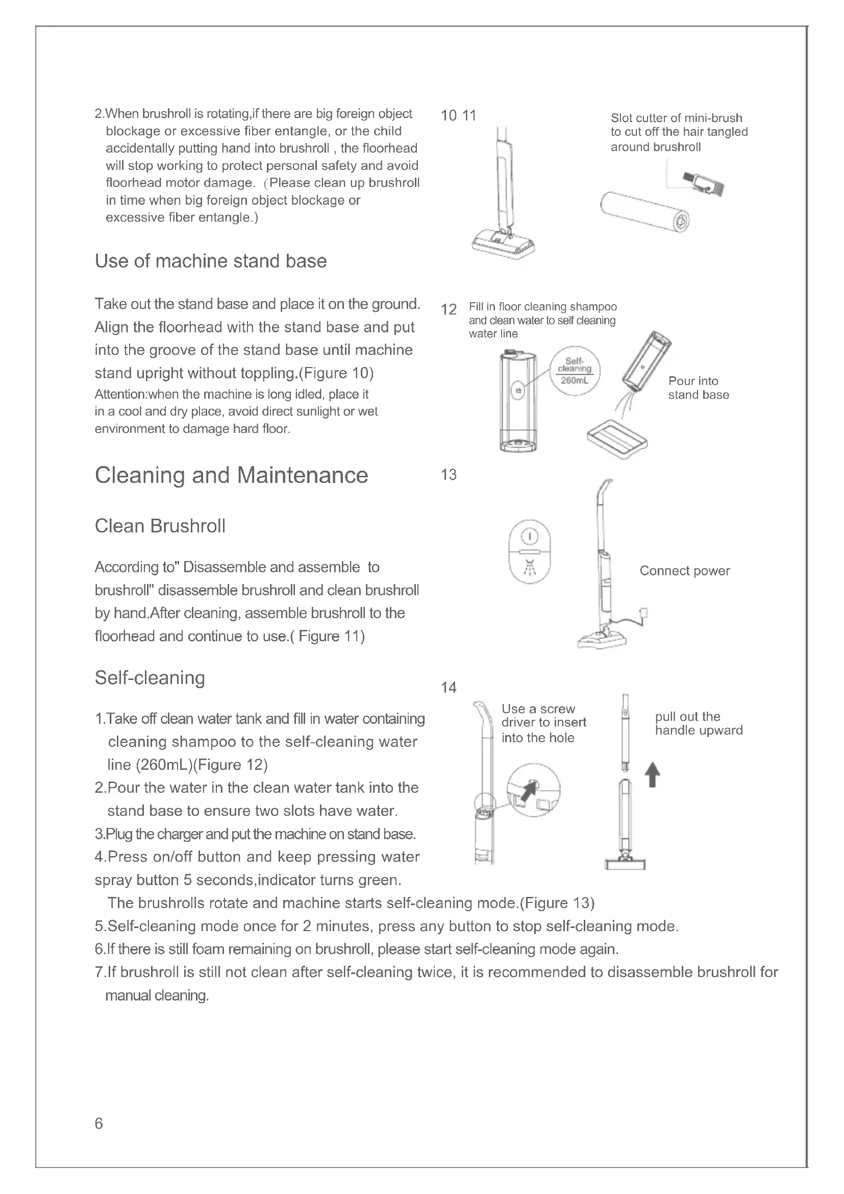 Slot cutter of mini-brush to cut off the hair tangled around brushroll Fill in oor cleaning shampoo and clean water to self cleaning water line Pour into stand base Connect power Use a screw driver to insert into the hole pull out the handle upward