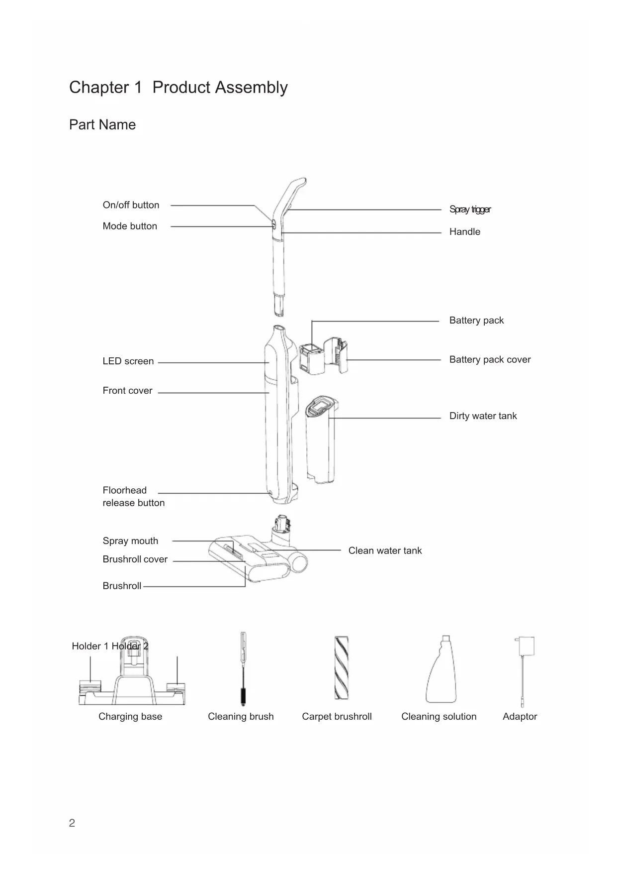 On/off button Mode button Front cover Floorhead release button LED screen Clean water tank Brushroll cover Brushroll Spray mouth Spray trigger Handle Battery pack Battery pack cover Dirty water tank Charging base Cleaning brush Carpet brushroll Cleaning solution Adaptor Holder 1 Holder 23 Packing list Product assembly Noted: Cut off electricity before product assembly and disassembly. Handle assembly and disassembly Insert the handle into the mainbody vertically until a“click”sound is heard. Make sure handle is firmly locked. To disassemble the handle, use a hard tool to insert into the handle release hole and meanwhile pull out the handle upward.(Fig 1) Floorhead assembly and disassembly Insert the floorhead into the mainbody vertically until a“click”sound is heard. Make sure floorhead is firmly locked.To disassemble the floorhead,press down the floorhead release button, then hold the floorhead and pull the oorhead down.(Fig 2) Assemble battery pack Press and hold the battery cover latch and remove the battery cover.Then,slide battery pack along the slot into mainbody until to the bottom, and then install the battery pack cover into the body until the clear "click" sound is heard. To remove battery pack, it can be disassembled according to the opposite direction of installation. (Fig 3) Assemble the charging base holder Press the holder 1 and holder 2 into the charging base, aiming at the slot until a “click” sound is heard. Make sure the holders are rmly locked.( Fig 4) Place machine to charging base To put machine back to charging base, hold machine handle to lift the machine, aim charging slot on bottom of machine to the charging socket on charging base and put the machine into charging base. To use the machine, hold machine handle and lift out machine from charging base. (Fig 5)
