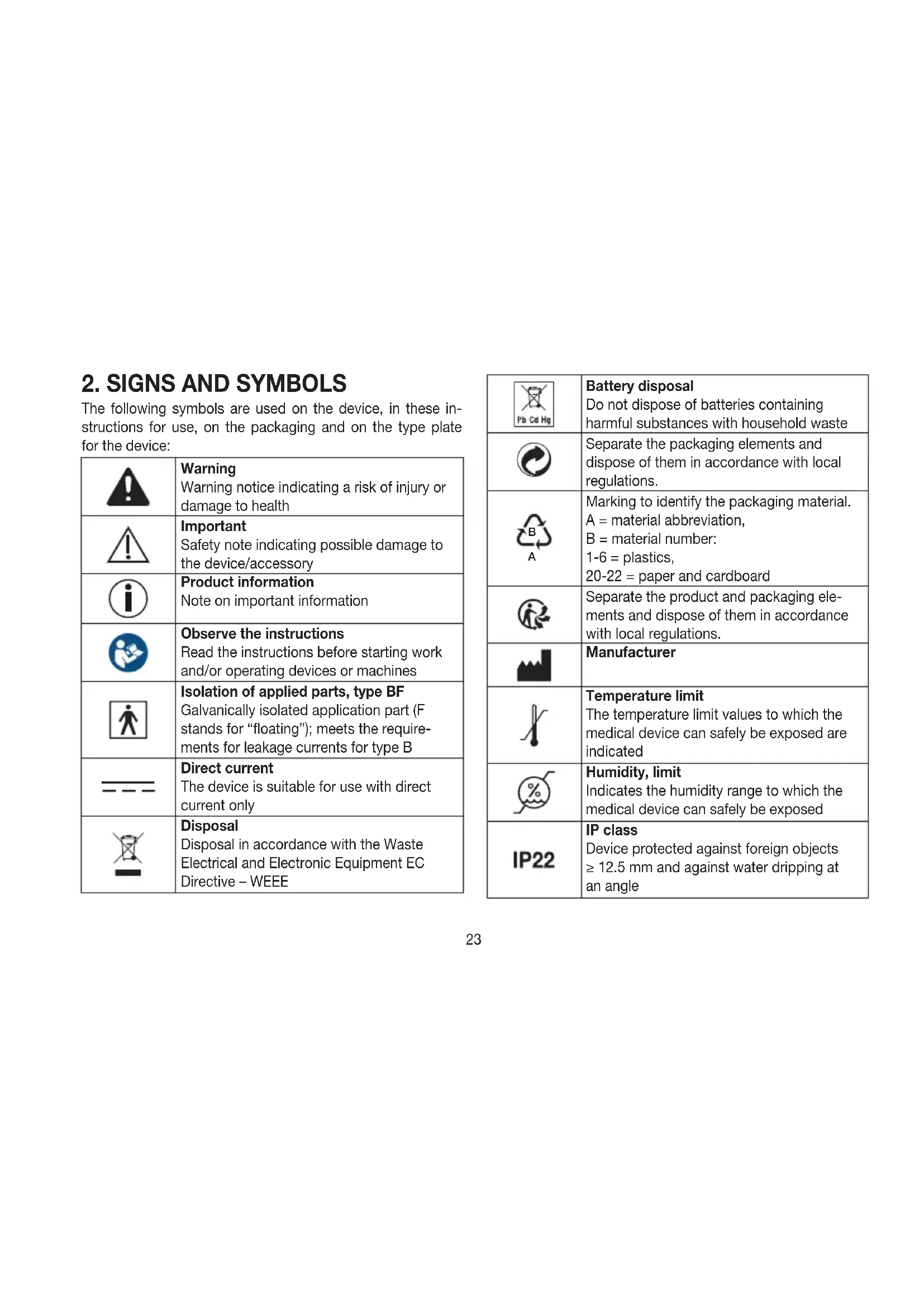The following symbols are used on the device, in these in- structions for use, on the packaging and on the type plate for the device: Warning Warning notice indicating a risk of injury or damage to health Important Safety note indicating possible damage to the device/accessory Product information Note on important information Observe the instructions Read the instructions before starting work and/or operating devices or machines Isolation of applied parts, type BF Galvanically isolated application part (F stands for “floating”); meets the require- ments for leakage currents for type B Direct current The device is suitable for use with direct current only Disposal Disposal in accordance with the Waste Electrical and Electronic Equipment EC Directive – WEEE Battery disposal Do not dispose of batteries containing harmful substances with household waste Separate the packaging elements and dispose of them in accordance with local regulations.