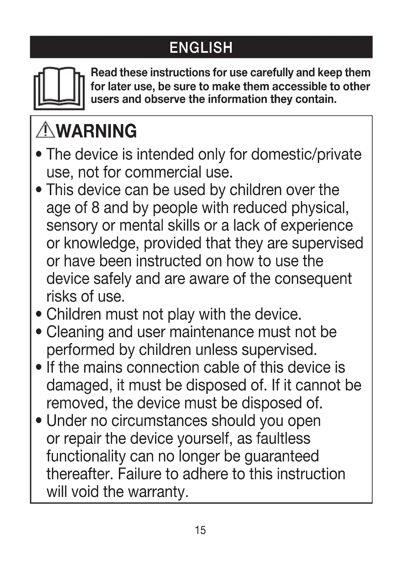 - The device is intended only for domestic/private use, not for commercial use.