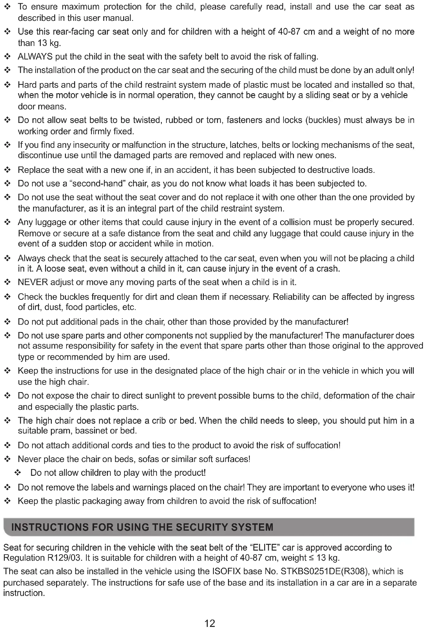 Install in this seat only if equipped with a 3-point seat belt. ATTENTION! WARNINGS! WARNING! NEVER LEAVE THE CHILD UNATTENDED! WARNING! DO NOT USE OTHER CONTACT POINTS THAN THOSE DESCRIBED IN THE INSTRUCTIONS AND MARKED ON THE CAR SEAT! WARNING! NEVER PLACE THE CAR SEAT ON A PASSENGER SEAT EQUIPPED WITH AN ACTIVE AIR BAG! THIS COULD RESULT IN DEATH OR SERIOUS INJURY! WARNING! THE VEHICLE SEAT BELTS THAT HOLD THE CHAIR TO THE CAR SEAT MUST BE TIGHTENED AND FASTENING! WARNING! THE SEAT BELTS THAT RETAIN THE CHILD MUST BE TIGHTENING AND FASTENING WELL, ADJUSTED ACCORDING TO THE BODY AND DIMENSIONS OF THE CHILD SO THAT THEY COVER THEM WELL. WARNING! THE LIP BELT SHOULD BE LOCATED LOW AND EACH PROTECTION BARRIER MUST BE INSTALLED CORRECTLY SO THAT THE CHILD’S PELVIS IS PROPERLY SUPPORTED WITHOUT PRESSURE. WARNING! DO NOT MAKE CHANGES, ADDITIONS OR MODIFICATIONS TO THE CAR SEAT WITHOUT THE APPROVAL OF THE NOTIFIED AUTHORITY! IT IS DANGEROUS NOT TO EXACTLY FOLLOW THE INSTRUCTIONS FOR USE PROVIDED BY THE MANUFACTURER! WARNING! KEEP OUT OF FIRE! 11 To ensure maximum protection for the child, please carefully read, install and use the car seat as described in this user manual. Use this rear-facing car seat only and for children with a height of 40-87 cm and a weight of no more than 13 kg. ALWAYS put the child in the seat with the safety belt to avoid the risk of falling. The installation of the product on the car seat and the securing of the child must be done by an adult only! Hard parts and parts of the child restraint system made of plastic must be located and installed so that, when the motor vehicle is in normal operation, they cannot be caught by a sliding seat or by a vehicle door means. Do not allow seat belts to be twisted, rubbed or torn, fasteners and locks (buckles) must always be in working order and rmly xed. If you nd any insecurity or malfunction in the structure, latches, belts or locking mechanisms of the seat, discontinue use until the damaged parts are removed and replaced with new ones. Replace the seat with a new one if, in an accident, it has been subjected to destructive loads. Do not use a “second-hand” chair, as you do not know what loads it has been subjected to. Do not use the seat without the seat cover and do not replace it with one other than the one provided by the manufacturer, as it is an integral part of the child restraint system. Any luggage or other items that could cause injury in the event of a collision must be properly secured. Remove or secure at a safe distance from the seat and child any luggage that could cause injury in the event of a sudden stop or accident while in motion. Always check that the seat is securely attached to the car seat, even when you will not be placing a child in it. A loose seat, even without a child in it, can cause injury in the event of a crash. NEVER adjust or move any moving parts of the seat when a child is in it. Check the buckles frequently for dirt and clean them if necessary. Reliability can be aected by ingress of dirt, dust, food particles, etc. Do not put additional pads in the chair, other than those provided by the manufacturer! Do not use spare parts and other components not supplied by the manufacturer! The manufacturer does not assume responsibility for safety in the event that spare parts other than those original to the approved type or recommended by him are used. Keep the instructions for use in the designated place of the high chair or in the vehicle in which you will use the high chair. Do not expose the chair to direct sunlight to prevent possible burns to the child, deformation of the chair and especially the plastic parts. The high chair does not replace a crib or bed. When the child needs to sleep, you should put him in a suitable pram, bassinet or bed. Do not attach additional cords and ties to the product to avoid the risk of suocation! Never place the chair on beds, sofas or similar soft surfaces! Do not allow children to play with the product! Do not remove the labels and warnings placed on the chair! They are important to everyone who uses it! Keep the plastic packaging away from children to avoid the risk of suocation!
