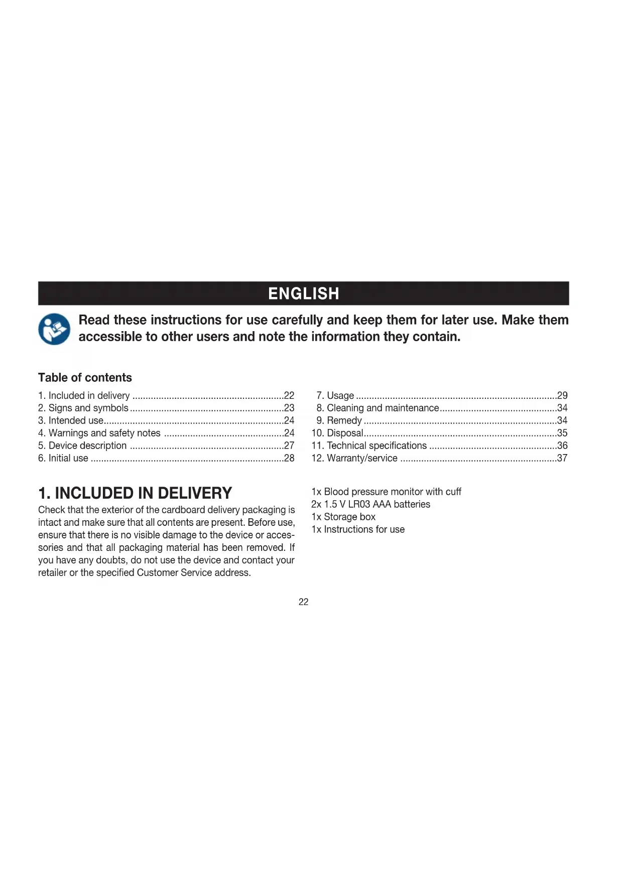 Check that the exterior of the cardboard delivery packaging is intact and make sure that all contents are present. Before use, ensure that there is no visible damage to the device or acces- sories and that all packaging material has been removed. If you have any doubts, do not use the device and contact your retailer or the specified Customer Service address. 1x Blood pressure monitor with cu 2x 1.5 V LR03 AAA batteries 1x Storage box 1x Instructions for use