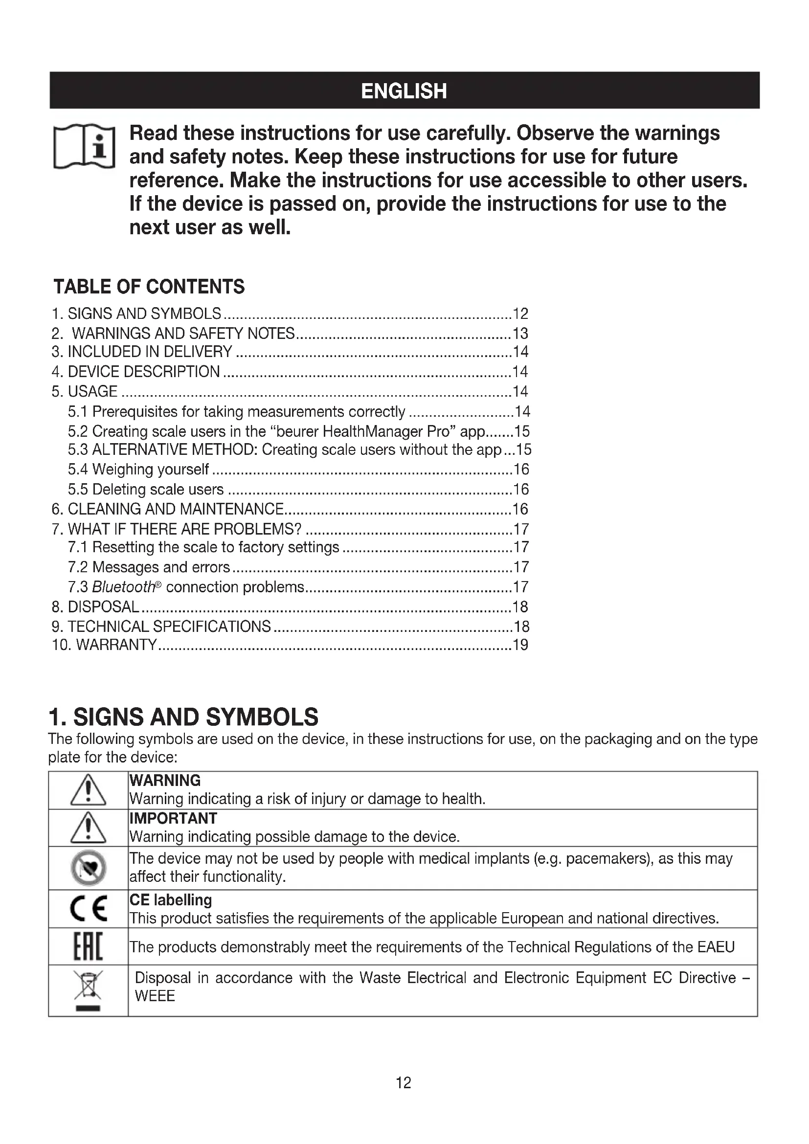 The following symbols are used on the device, in these instructions for use, on the packaging and on the type plate for the device: WARNING Warning indicating a risk of injury or damage to health. IMPORTANT Warning indicating possible damage to the device. The device may not be used by people with medical implants (e.g. pacemakers), as this may aect their functionality. CE labelling This product satisfies the requirements of the applicable European and national directives. The products demonstrably meet the requirements of the Technical Regulations of the EAEU Disposal in accordance with the Waste Electrical and Electronic Equipment EC Directive – WEEE13 Do not dispose of batteries containing hazardous substances with household waste United Kingdom Conformity Assessed Mark Manufacturer Separate the packaging elements and dispose of them in accordance with local regulations. Read the instructions for use